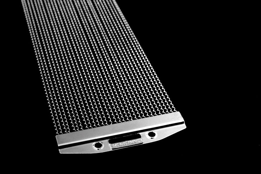 Snare wires which enhance even the subtitles of nuances in the midst of very loud backbeats! By adopting spiral wires with an abundance of coils coupled with 1mm end-plates, we have achieved a good balance between volume that is aggressive enough for a powerful backbeat and swift response for delicate phrasing. With this one snare wire, you can have an aggressive, loud snare sound and maintain sensitivity.