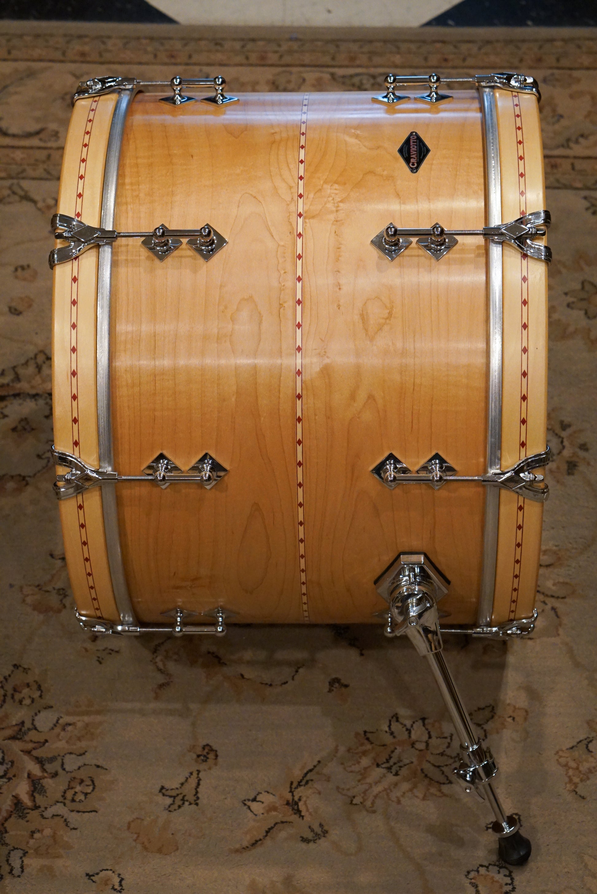 A new Craviotto maple drum set (No. 1119) made in Nashville, TN in 2024 with steam-bent single-ply shells, tube lugs, triple flanged hoops, and no bass drum mount. It features Craviotto's hybrid bearing edge, which is rounded to the outside, with an angled interior cut. 8x10", 8x12" rack toms, 14x14" and 16x16" floor toms, and 14x20" kick drum. This kit sounds warm and a bit dry. As rich, warm, and punchy as it gets.