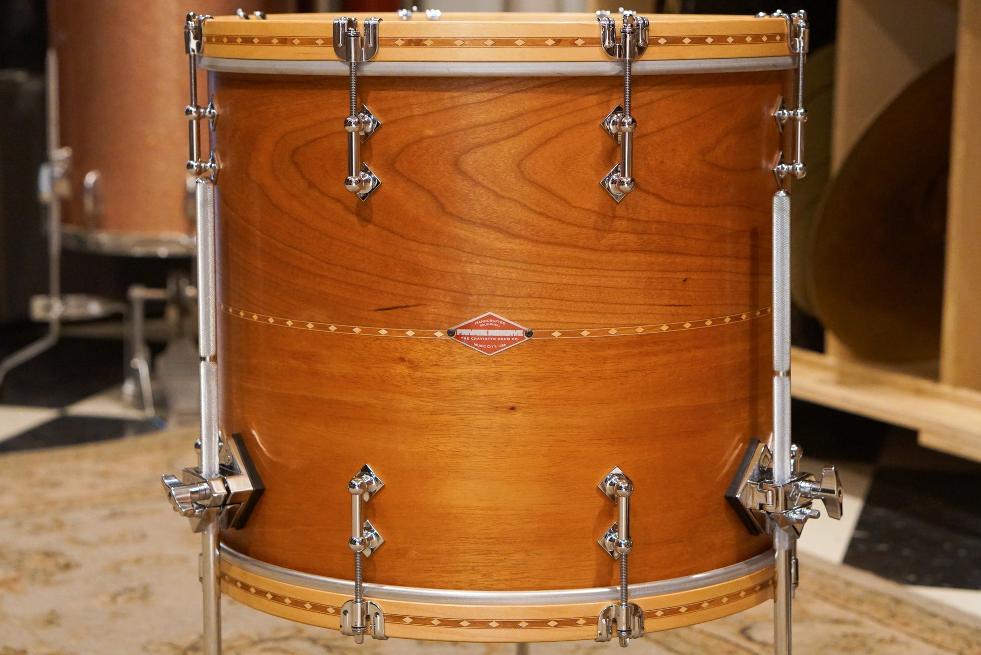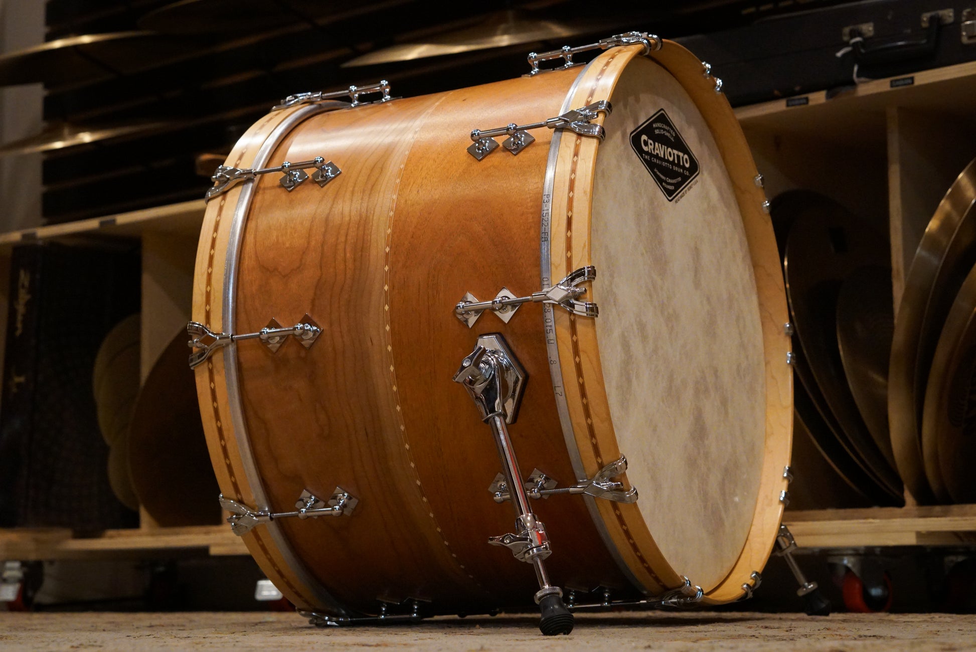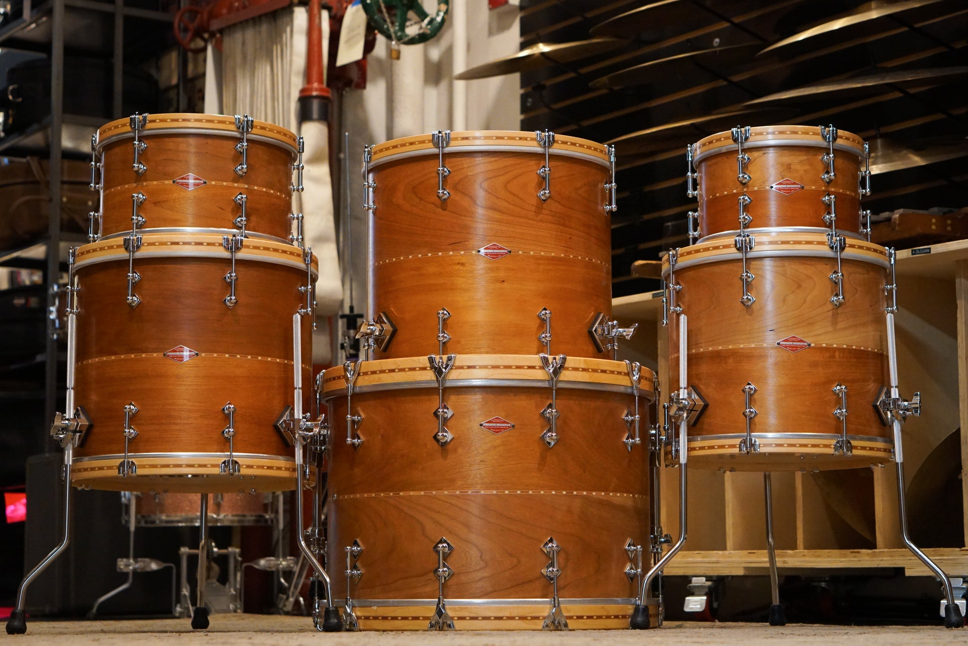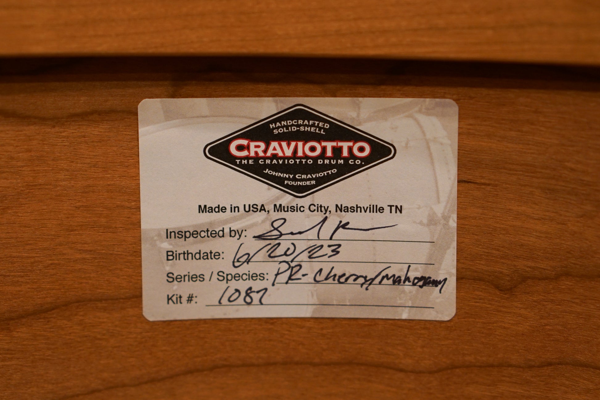 A remarkable Craviotto drum set (No. 1087) made in Nashville, TN in 2023 with steam-bent single-ply shells, tube lugs, wood flanged hoops, and no bass drum mount. The shells are stacked cherry and mahogany, and feature Craviotto's hybrid bearing edge, which is rounded to the outside, with an angled interior cut. 7x11" and 8x13" rack toms, 13x15", 14x16, and 15x17" floor toms, and a 15x22" kick drum. This kit sounds airy and resonant and the tone is about as rich and punchy as it gets.