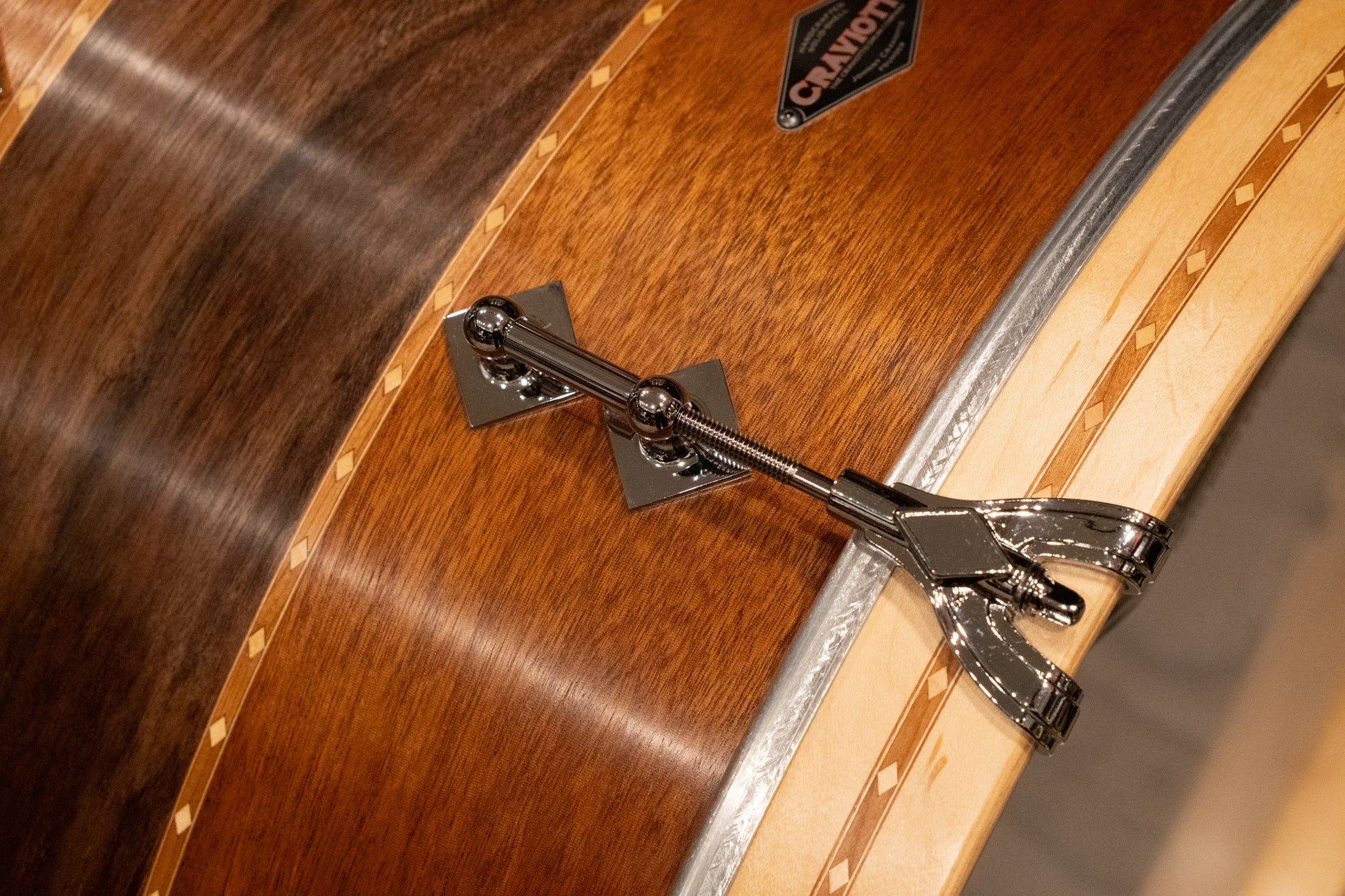 A 2024 Craviotto Walnut/Mahogany drum set made with steam-bent shells, double walnut inlay tube lugs and triple flanged hoops. 8x12" mounted tom, 14x14" floor tom, and 14x20" kick drum. All original, in great condition and sounds incredible across the tuning range.