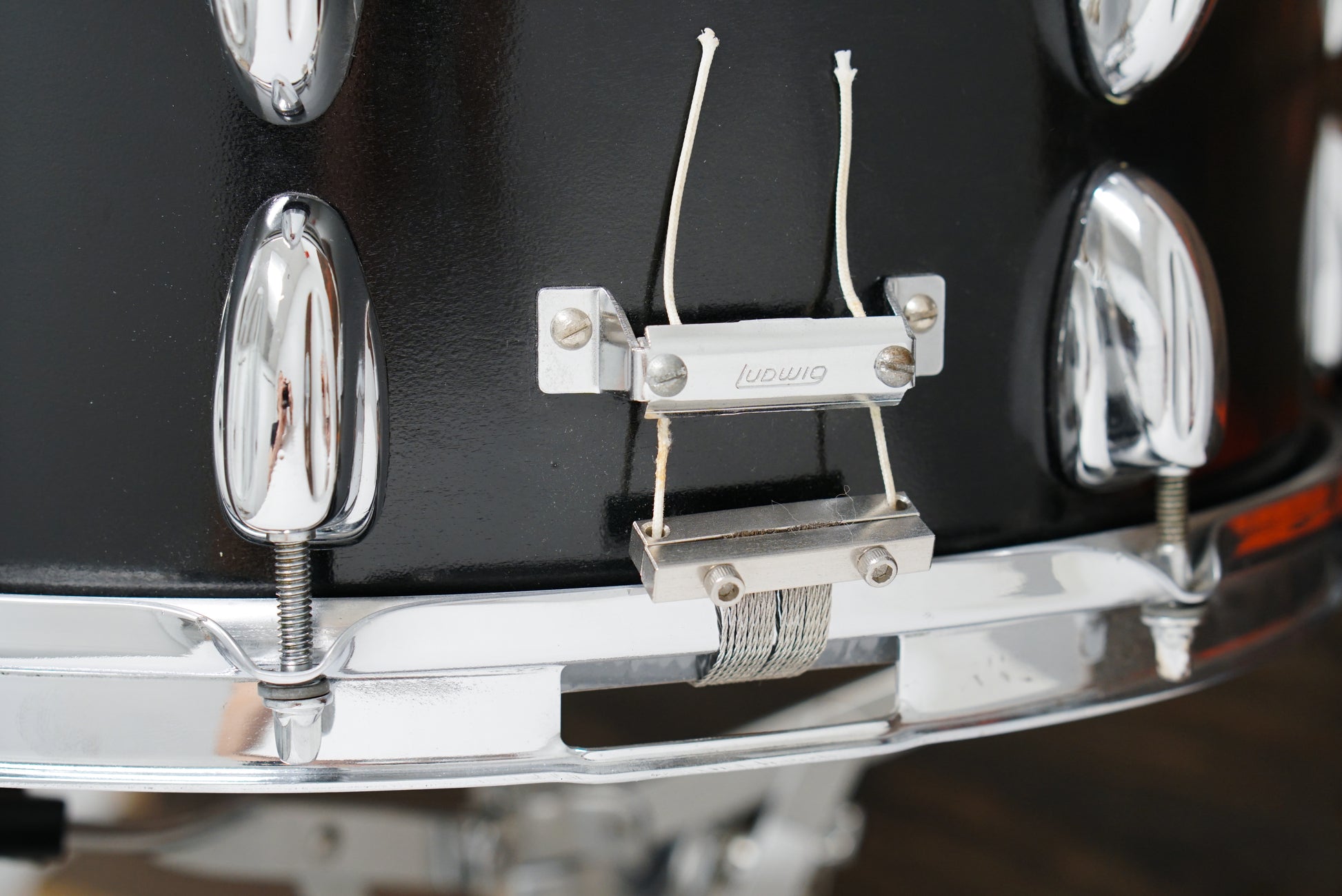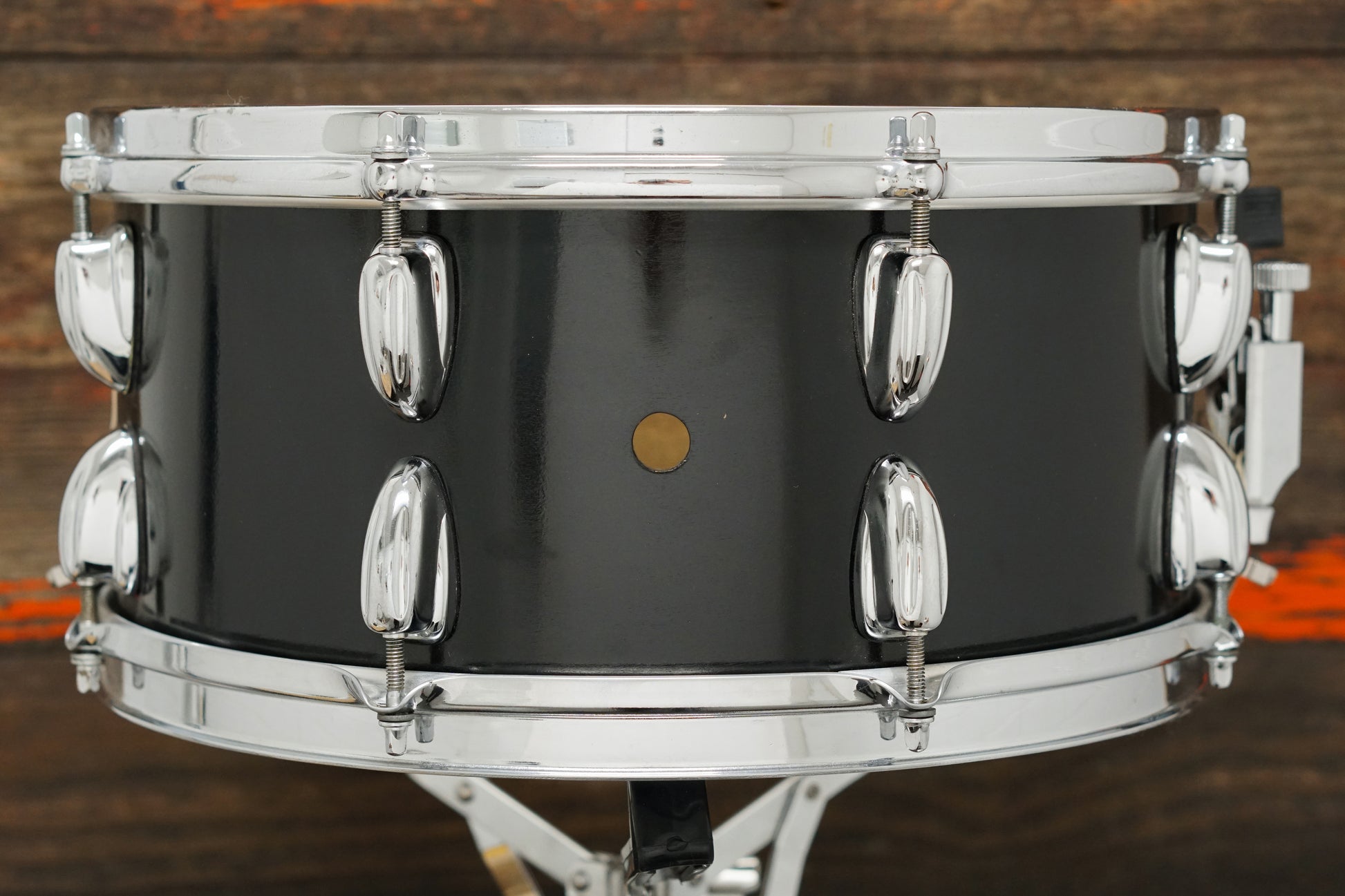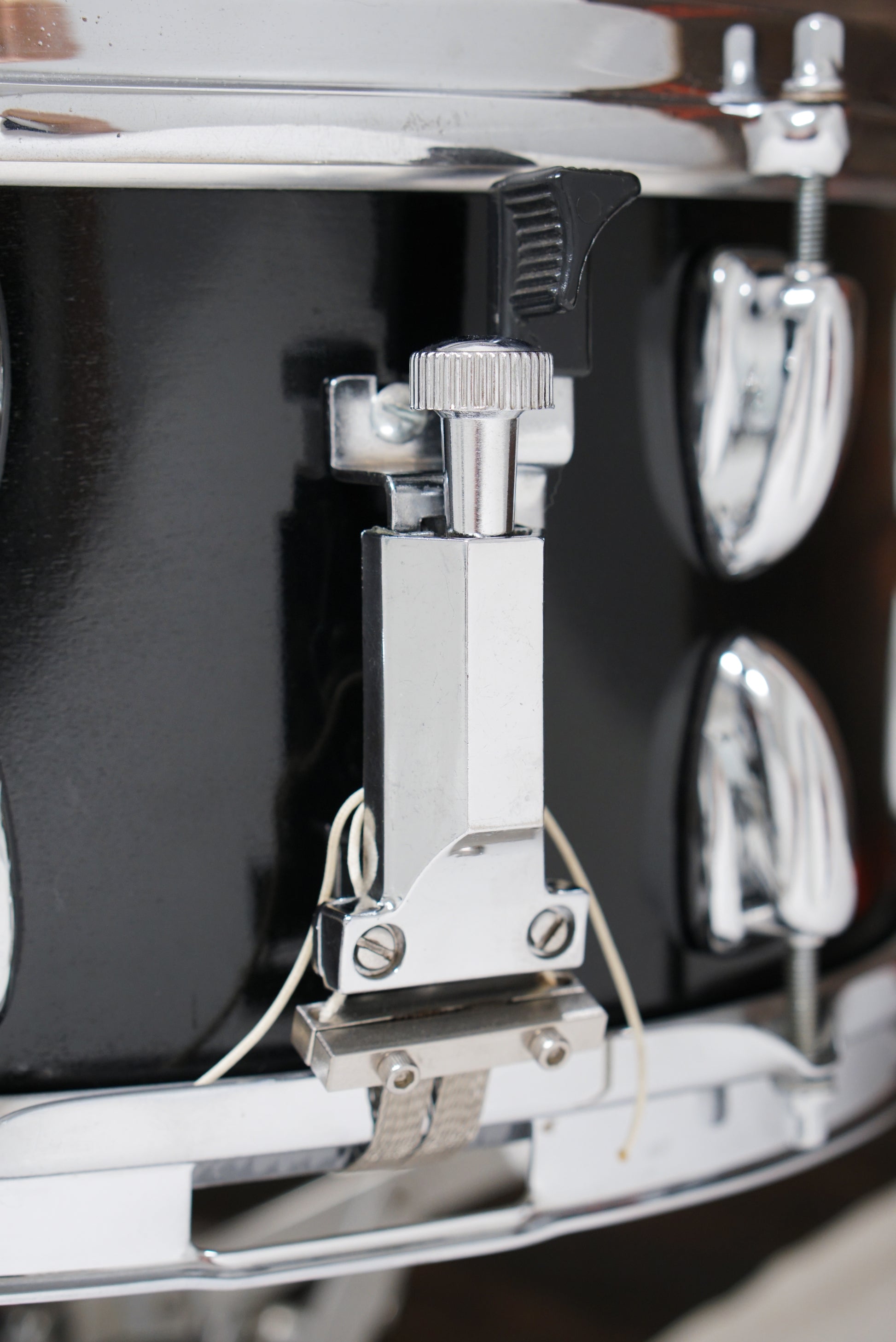 A custom built, un-branded concert snare drum with a low-key black painted finish. 6.5x14" eight-ply shell, 16 Slingerland style lugs, Lever throw off, Ludwig butt plate, Premier die-cast batter hoop, triple-flanged snare side hoop, and cable snare wires. Dry and crisp. A real who's who of snare drums.