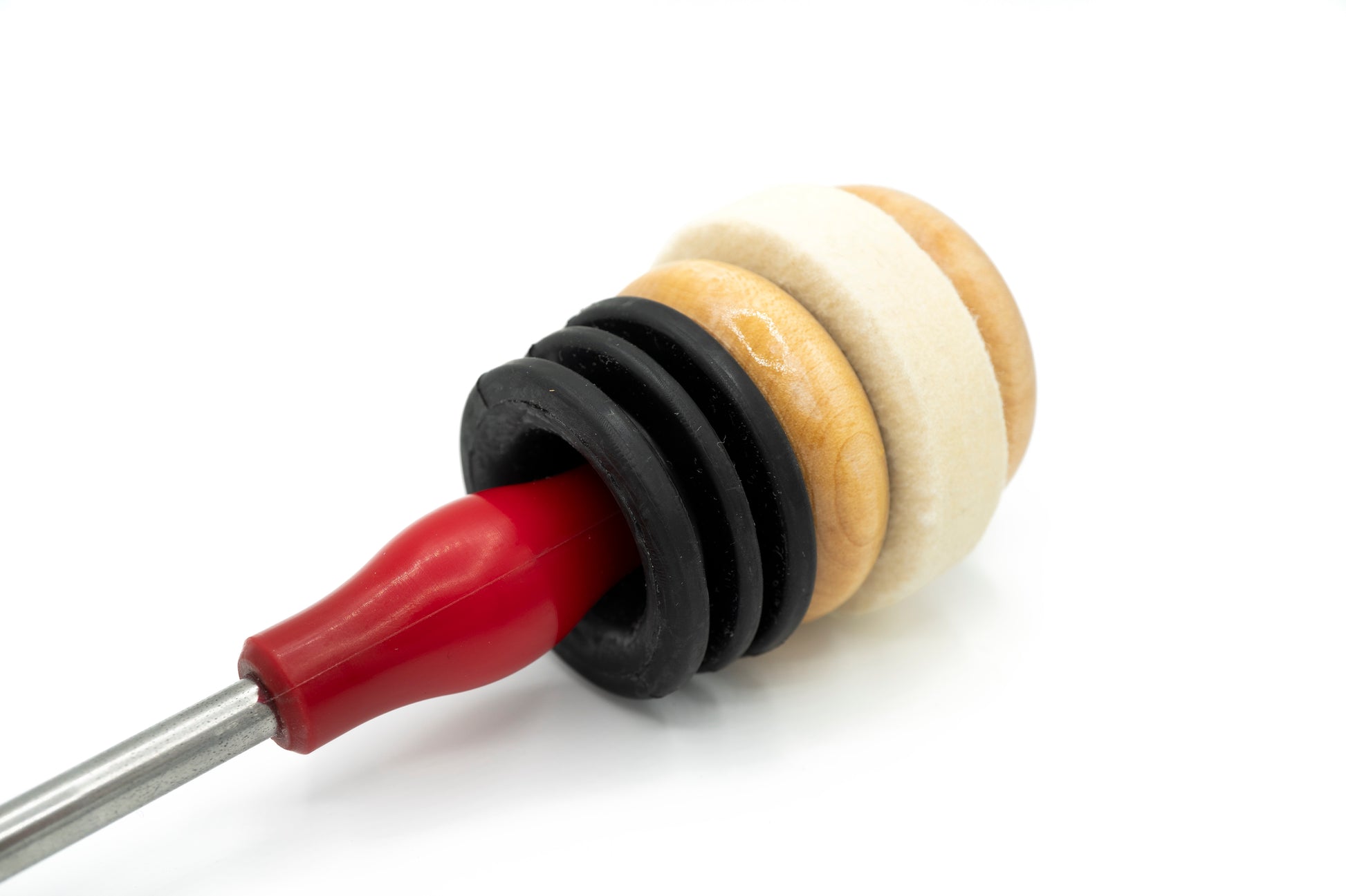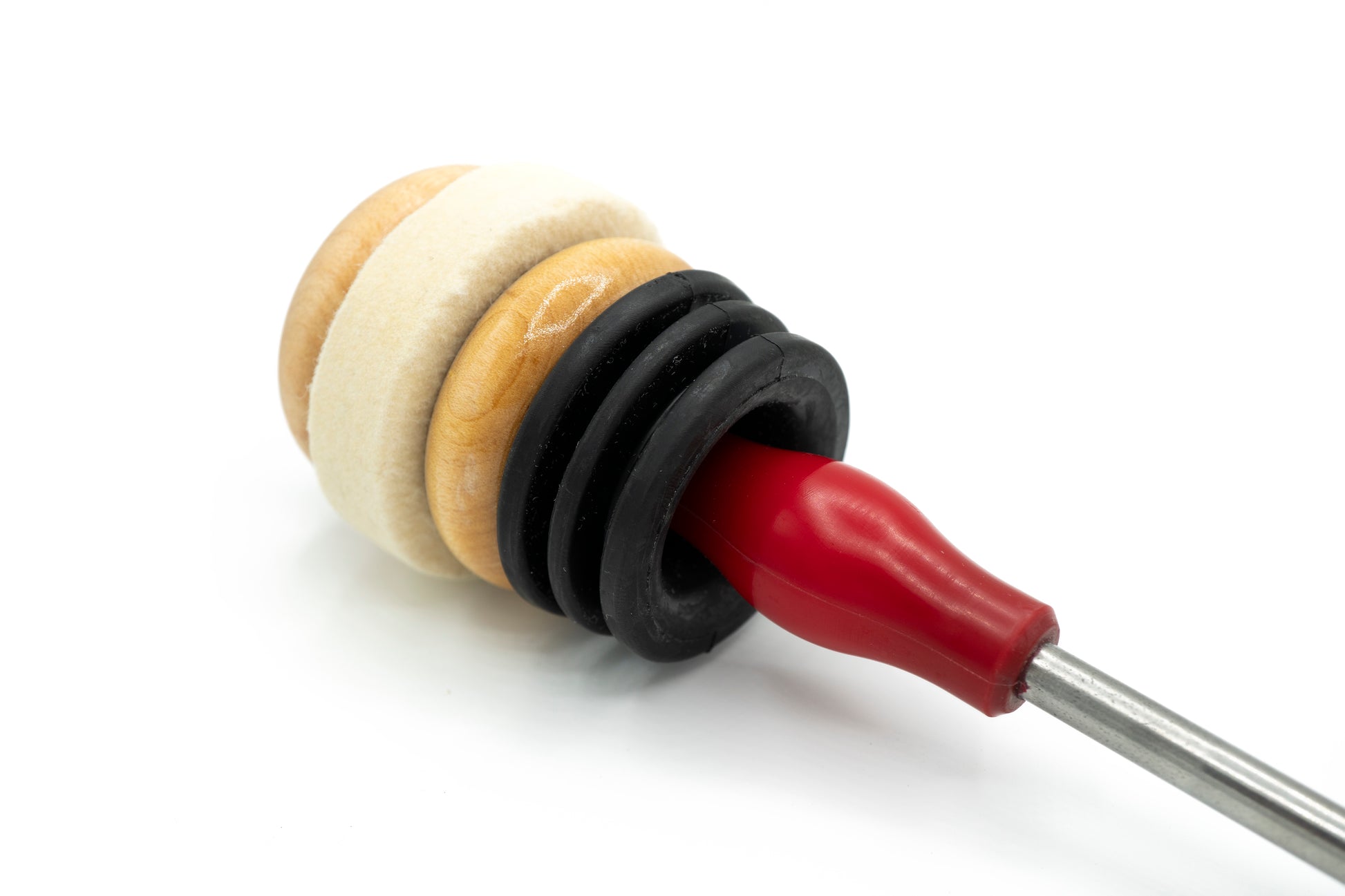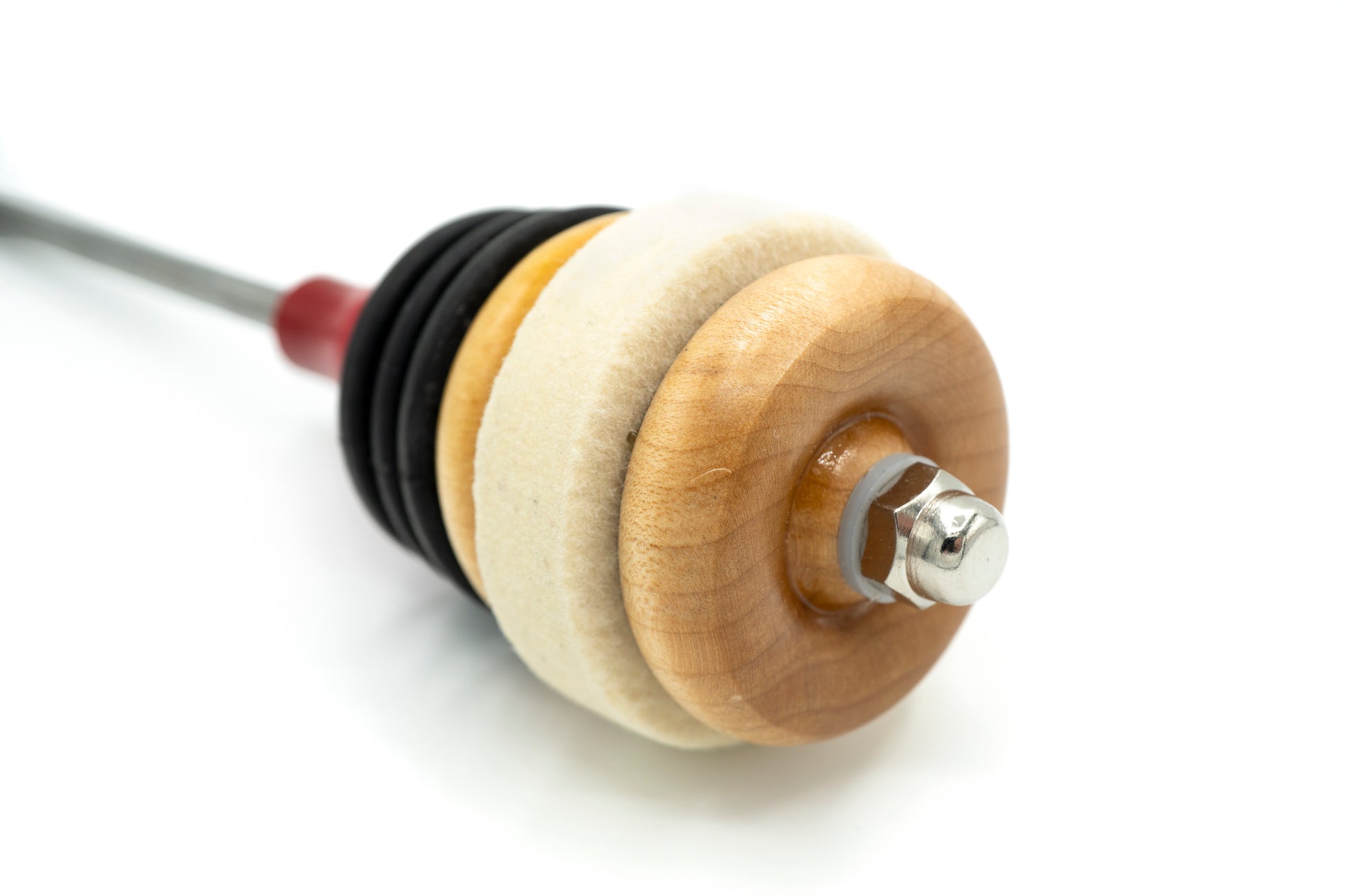 The FlexBurger is a BurgerBeater with a steel shaft and wood top and bottom sandwiching a felt burger. This is no ordinary felt. German wool piano felt. Combine that with the FlexBeater patented technology and you have an amazing combination. Three hitting surfaces here. The clarity of hardwood, the warmth of felt and and amazing punch from the rubber shoulder! All at your beck and call. No need to switch beaters because it's all there and ready to go.