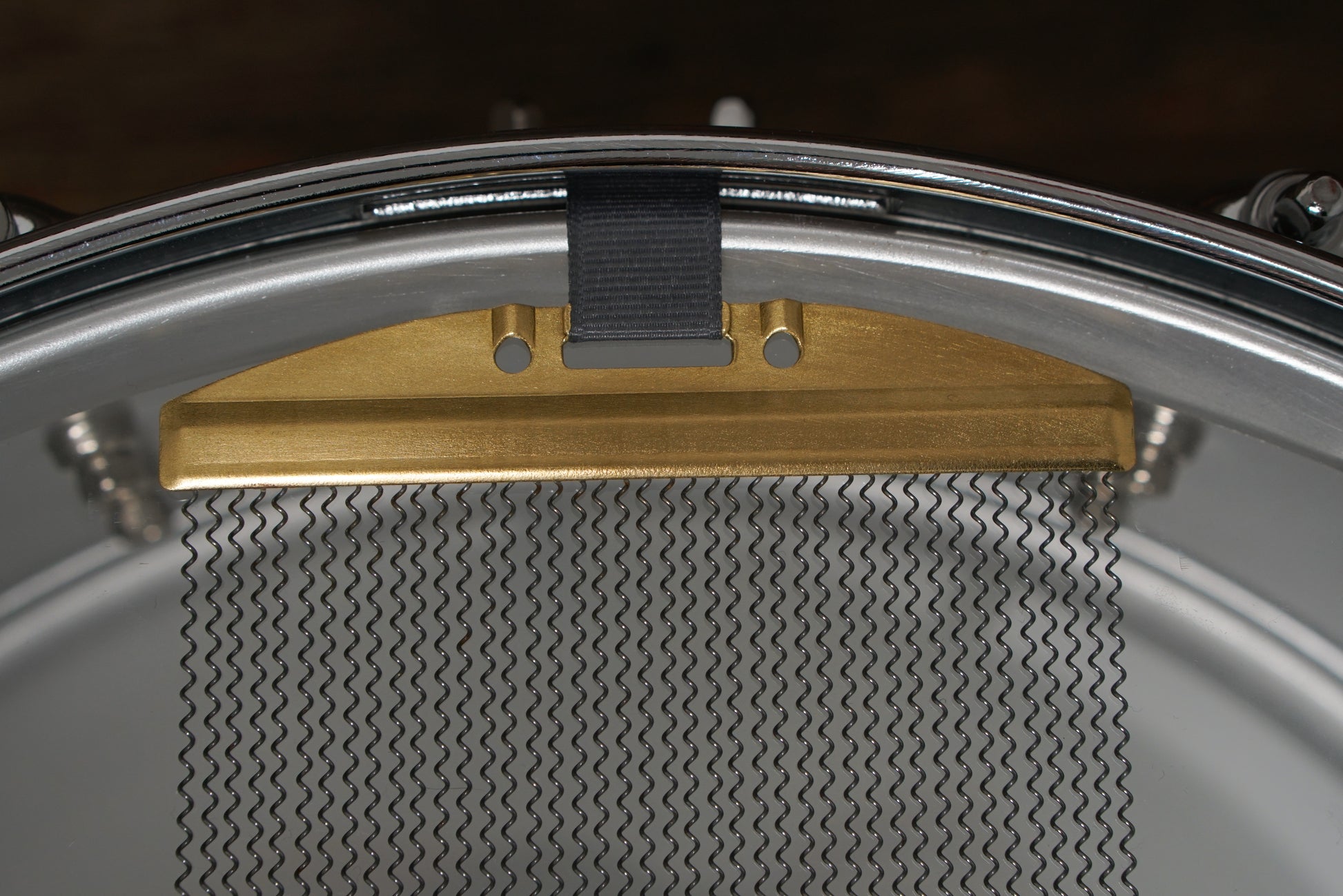 A Geo Way "Aristocrat" Model snare drum made by Ronn Dunnett. Double-beaded aluminum shell, chrome plated hardware, eight turret lugs, Precision throw off, double-flanged hoops, and Presence 42-strand snare wires. The shell is in very good condition, with some light pitting on the chrome plating. Fat, warm, and very dynamic.