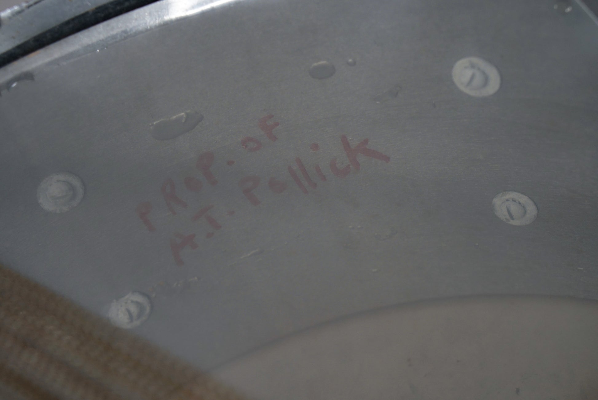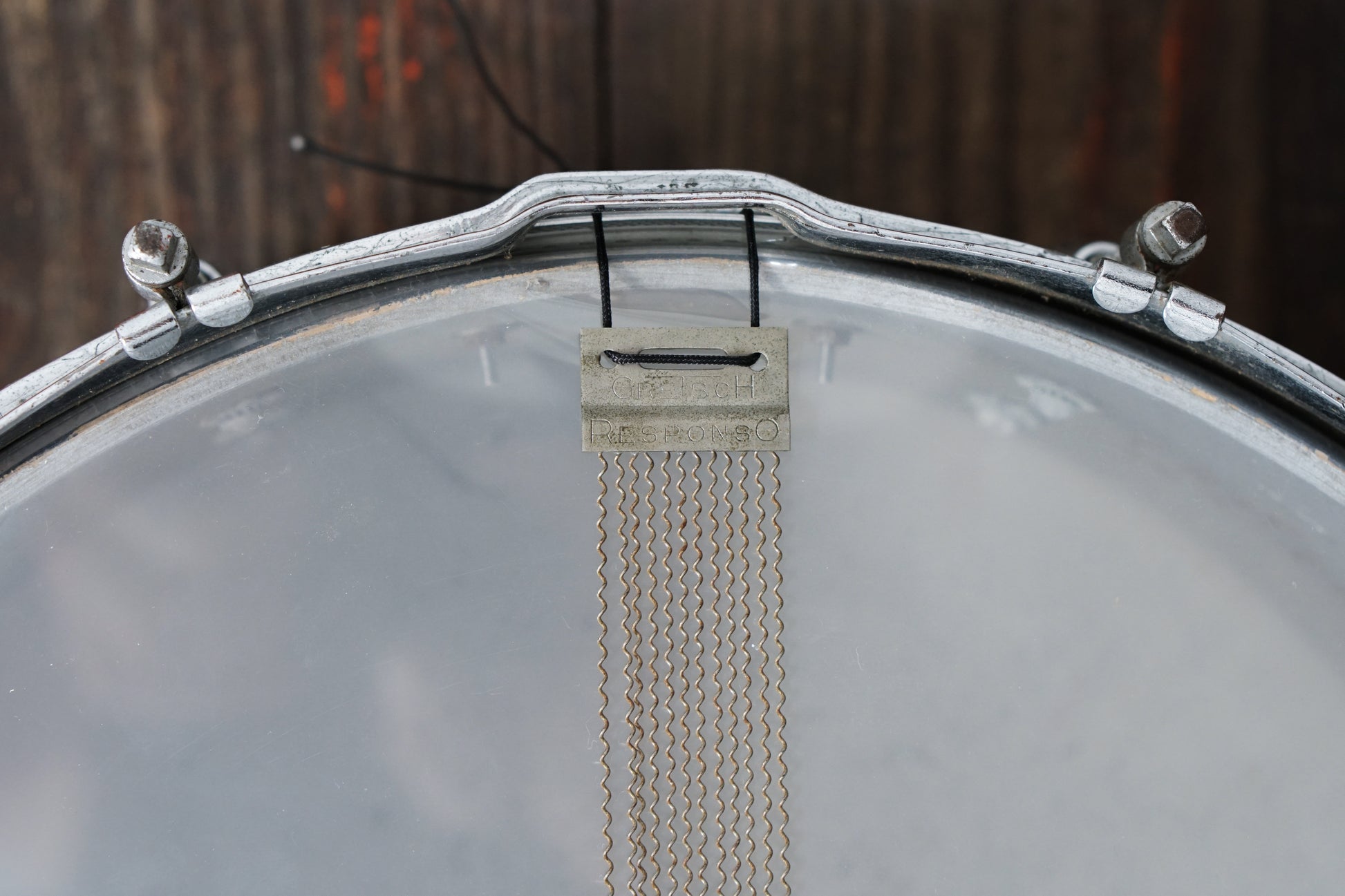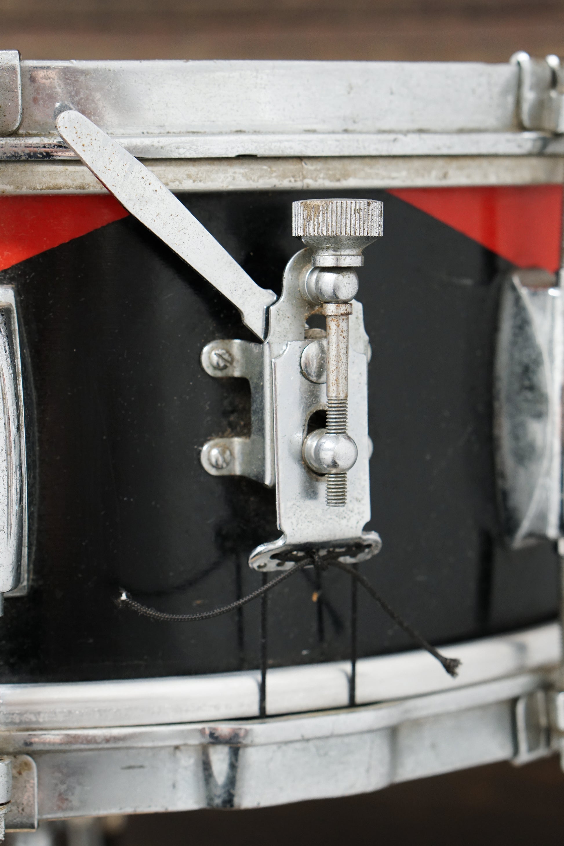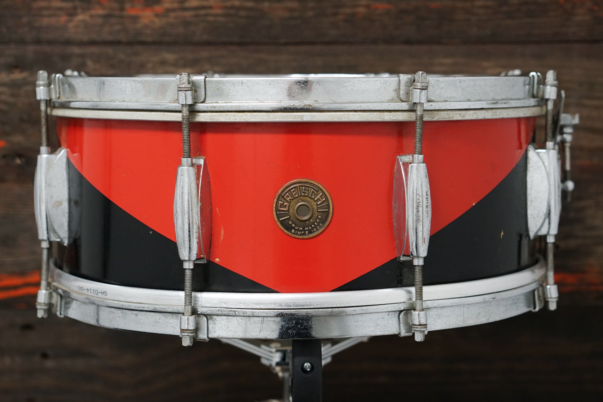 A late 1950s/early '60s Gretsch 5.5x14" Renown Model snare drum. Eight lugs, Renown-strainer with original snare wires, single-flanged hoops with mini claws. Silver sealer interior, pre paper-tag. The harlequin finish is rarely seen, and rarely in good condition. This one has a few small scratches here and there, and age-typical scuffing and wear on the chrome. Swampy and nasty sounding with a nice translucence in the tone.
