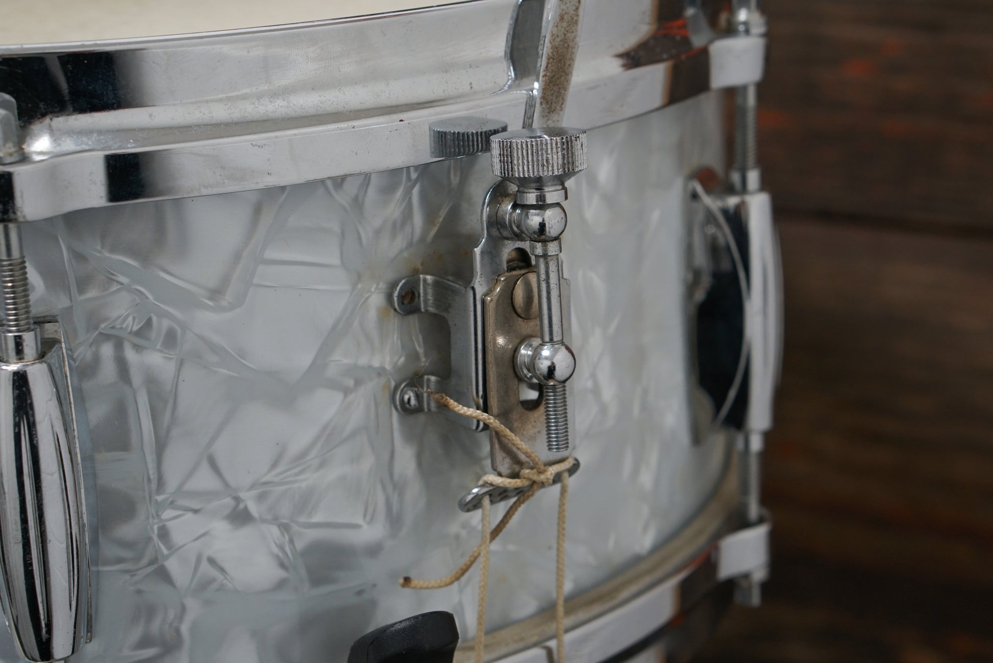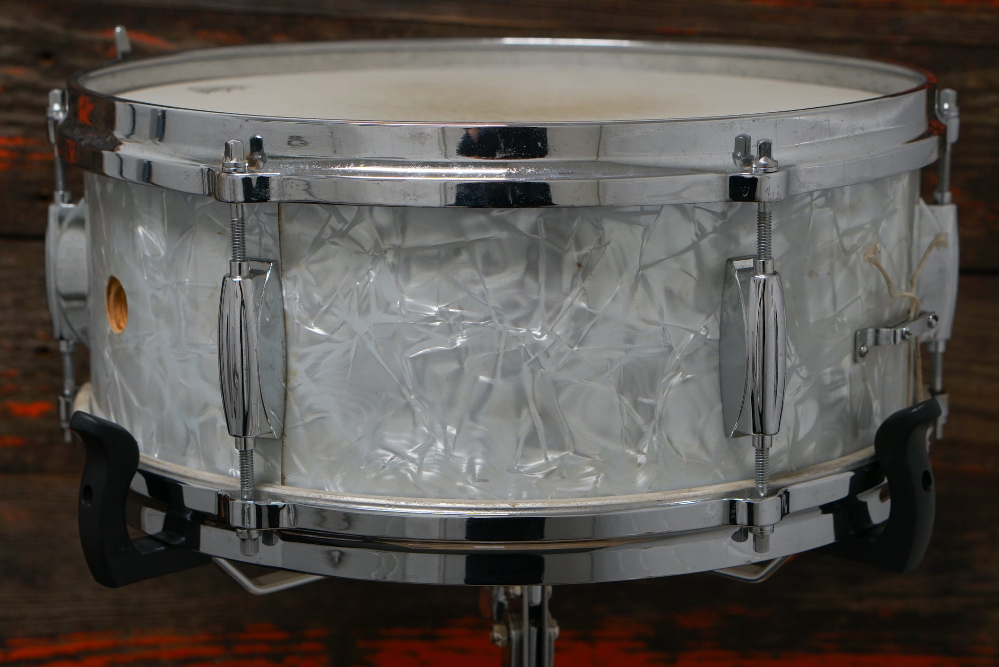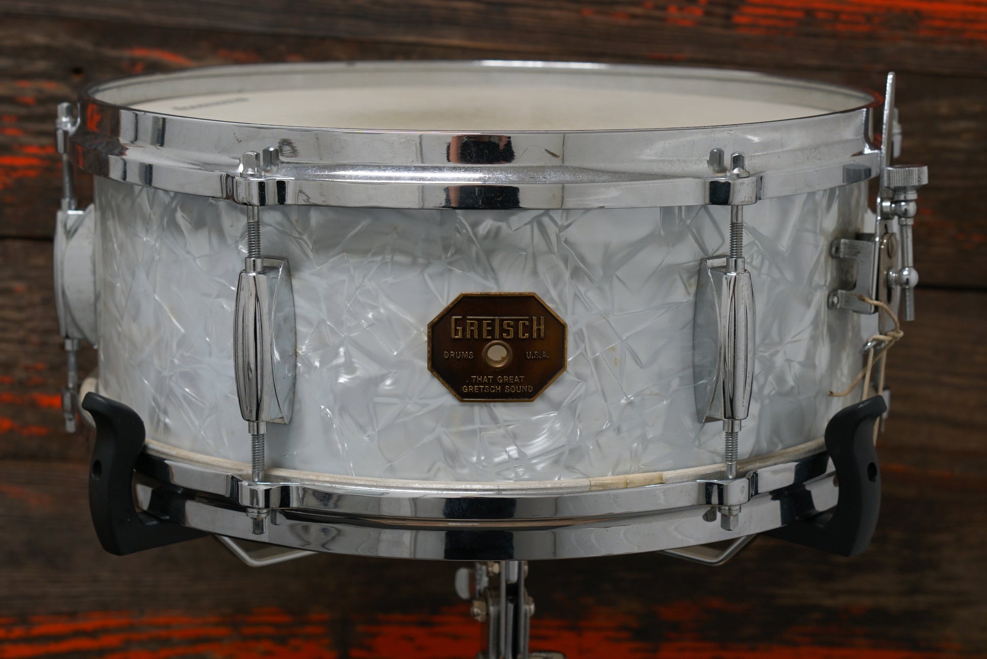 A delightful vintage 1970's Stop Sign Badge Gretsch 5.5x14" Renown snare drum in white marine pearl. Six lugs, die-cast hoops, Renown throw-off, and six ply maple/gum Gretsch formula shell. The hole is for the snap in key holder, which is missing, but those parts are readily available. In great condition for its age, with a vibrant shade of WMP. Delightfully responsive and dry.