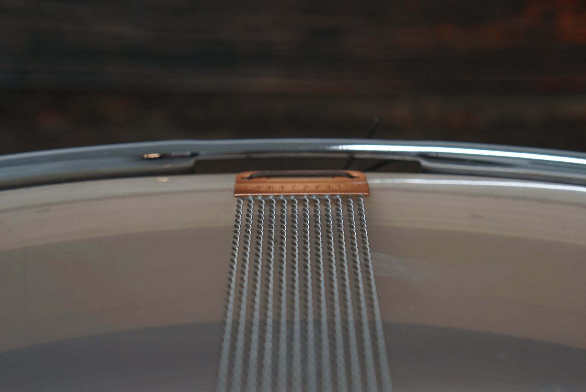 A pre-owned Joe Montineri 6.5x14" mahogany snare drum. Three-ply shell with reinforcing rings, eight lugs, and Puresound snare wires. Warm, meaty, and articulate and in great condition.