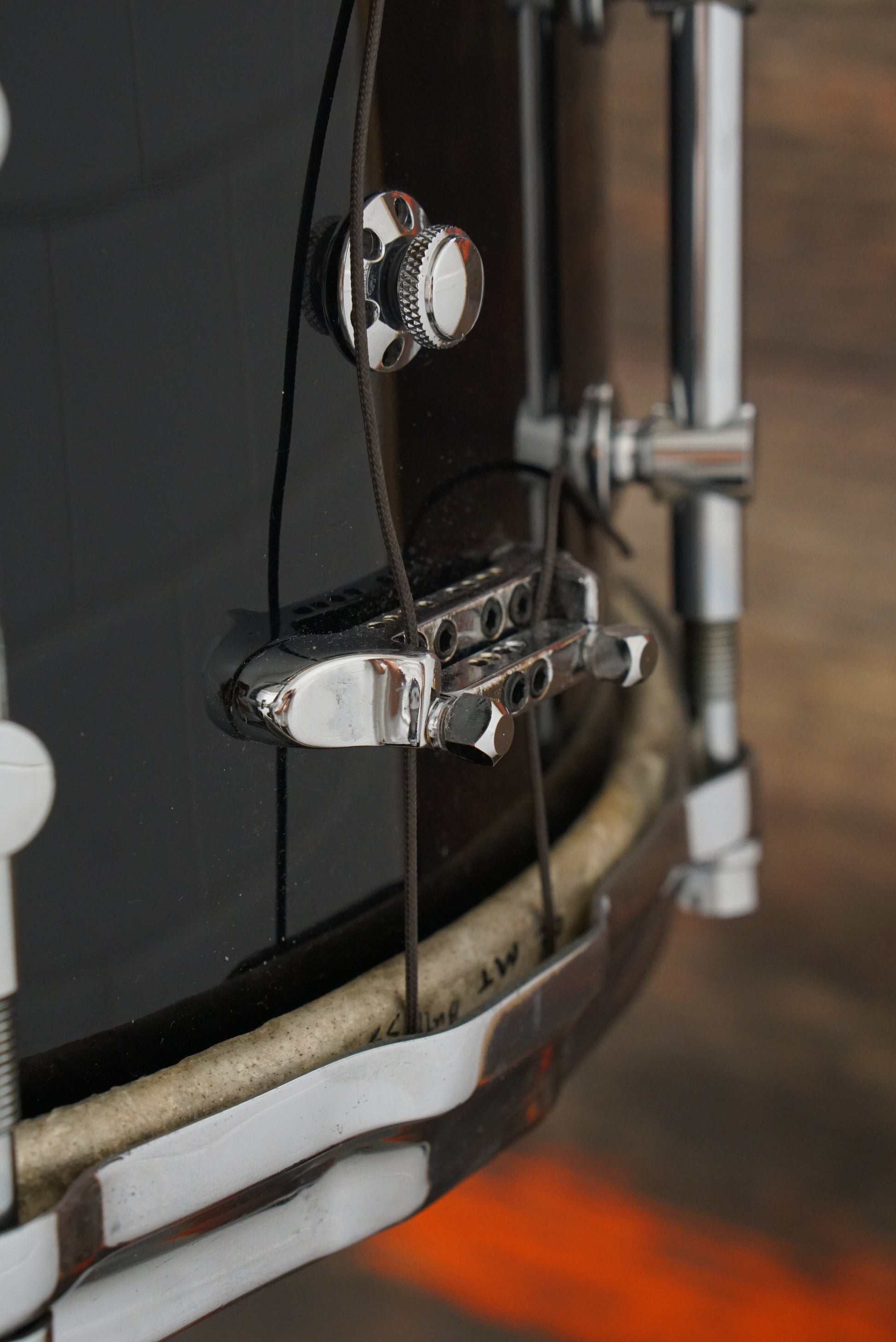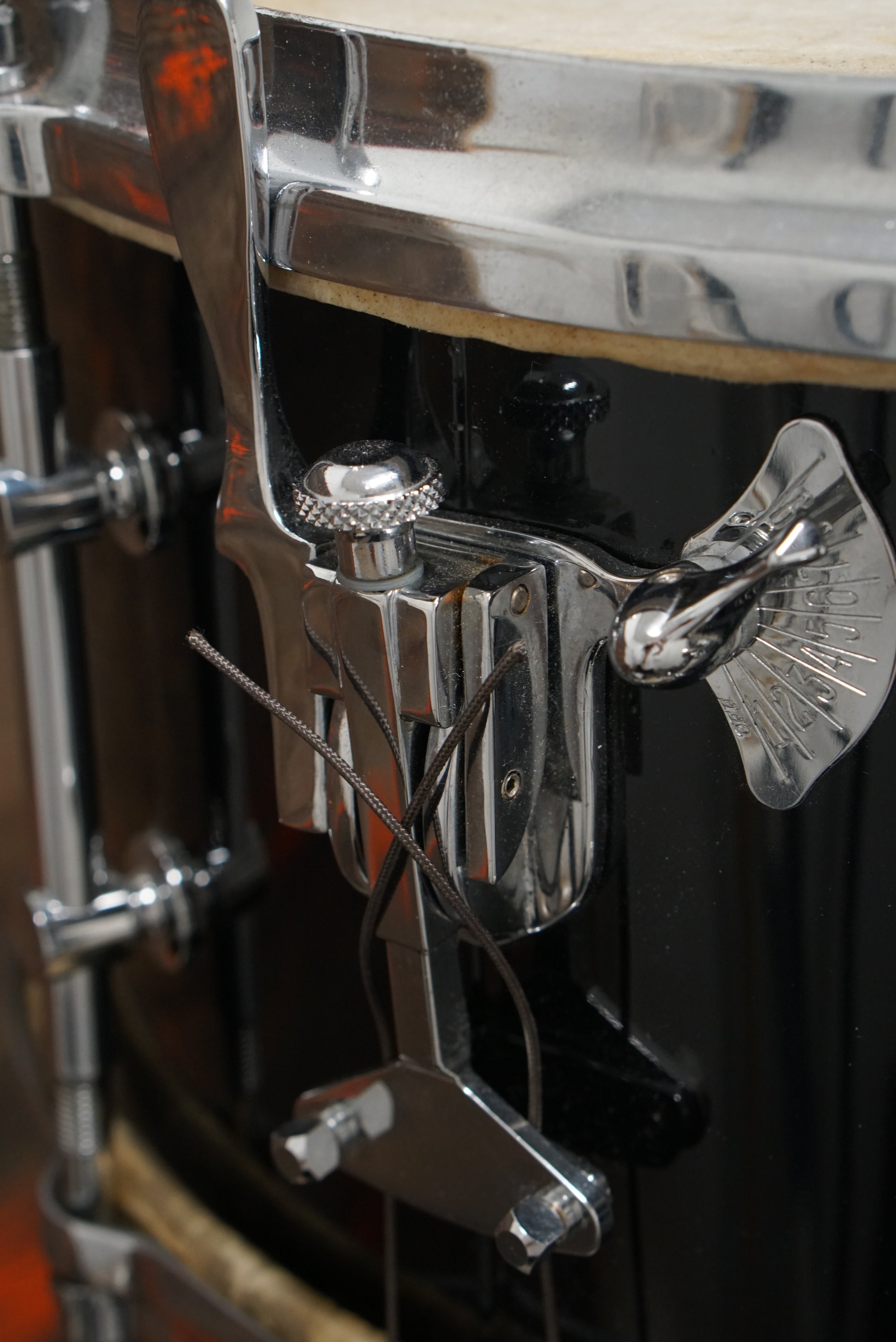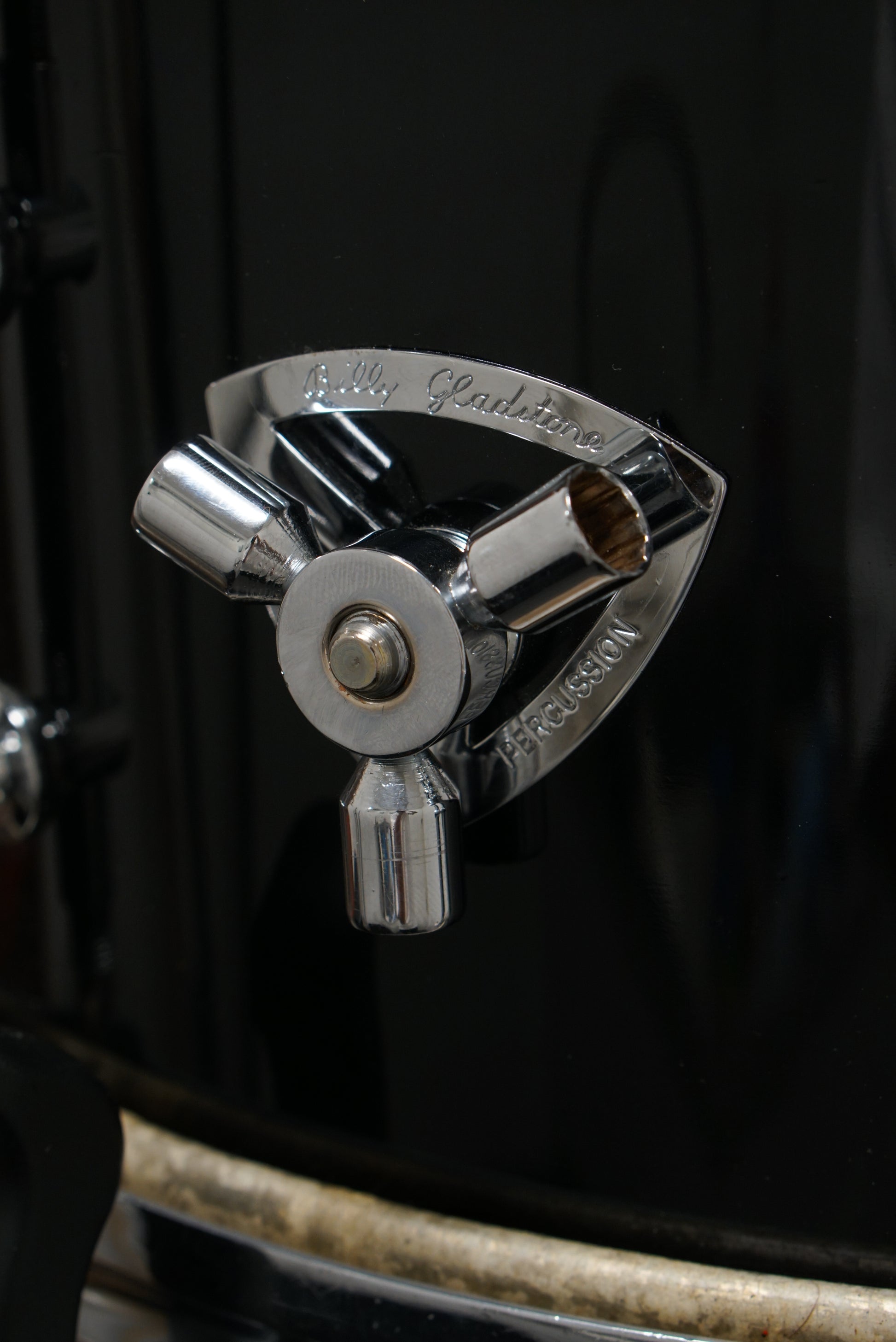 In 1937 Billy Gladstone patented a mechanism for tuning drums that employed the use of a special key that allowed for the top and bottom heads to be tuned individually, or at the same time—all from the top of the drum. This brilliant mechanism saved players time and the hassle of flipping the drum upside-down or reaching awkwardly underneath the drum to tune the snare side head. Gladstone also created unique and elegant throw off and tone control designs. Very few of these original drums have survived.