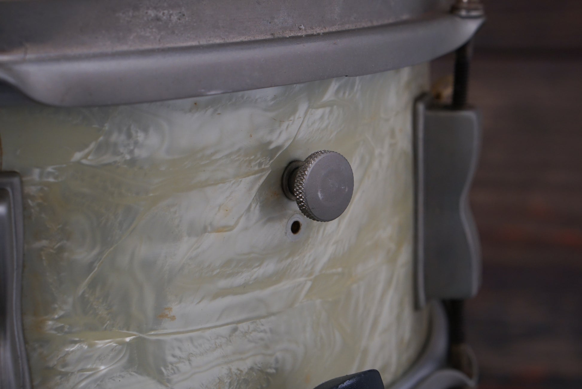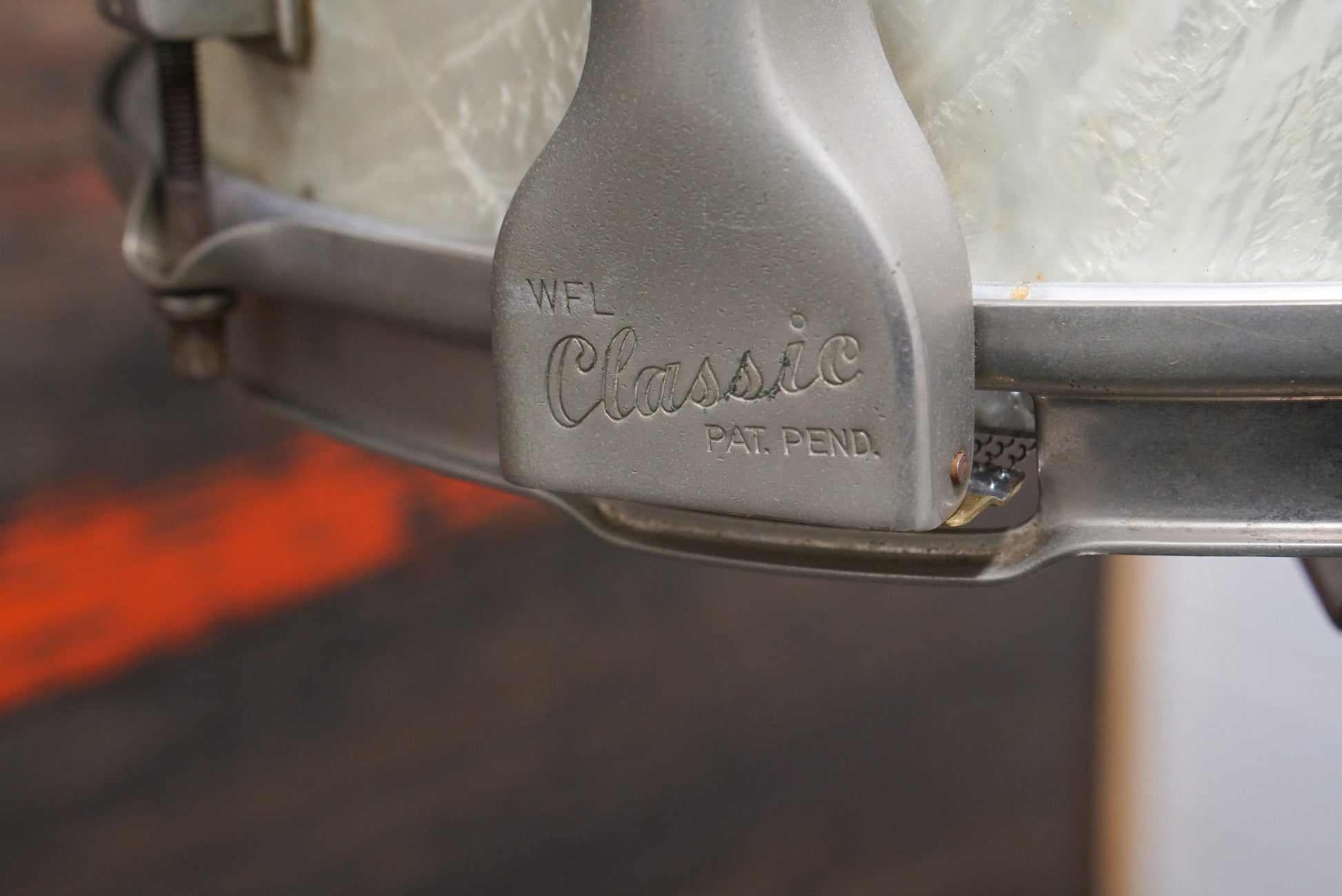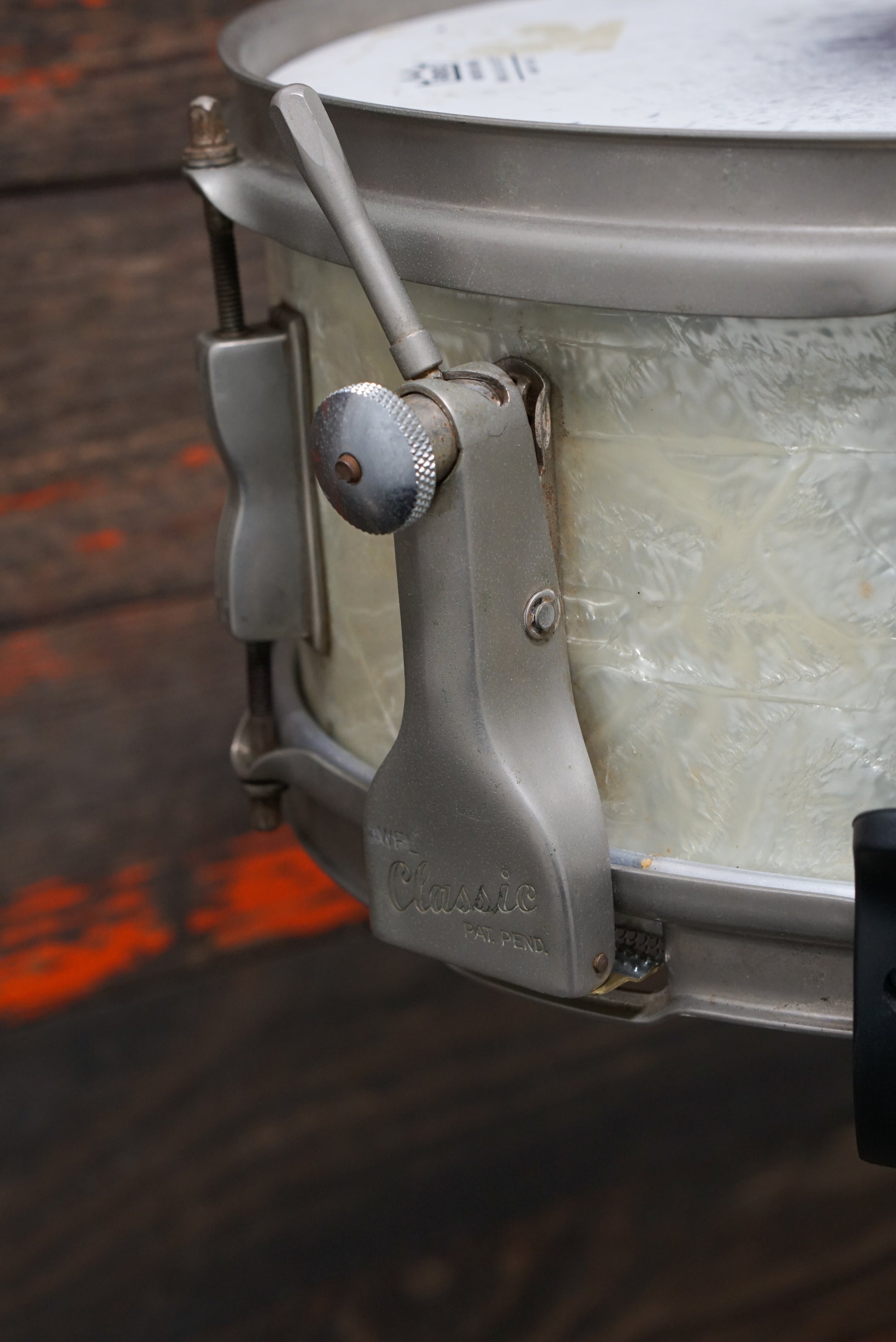 This is a WFL (Ludwig) 5x13" Porto-Pak model snare drum made between 1953-1956. These snares were made for gigging drummers who needed a powerful, yet small and lightweight snare. With six lugs, internal tone control, and classic Ludwig P87 throw-off, it's rare bird that has definitely been played, but is still well kept. The WMP finish has some discoloration and blemishes, and there is some rusting on the hardware, but the snare is in great working order. A treasure for anyone looking for something compact, vintage and sonically epic!