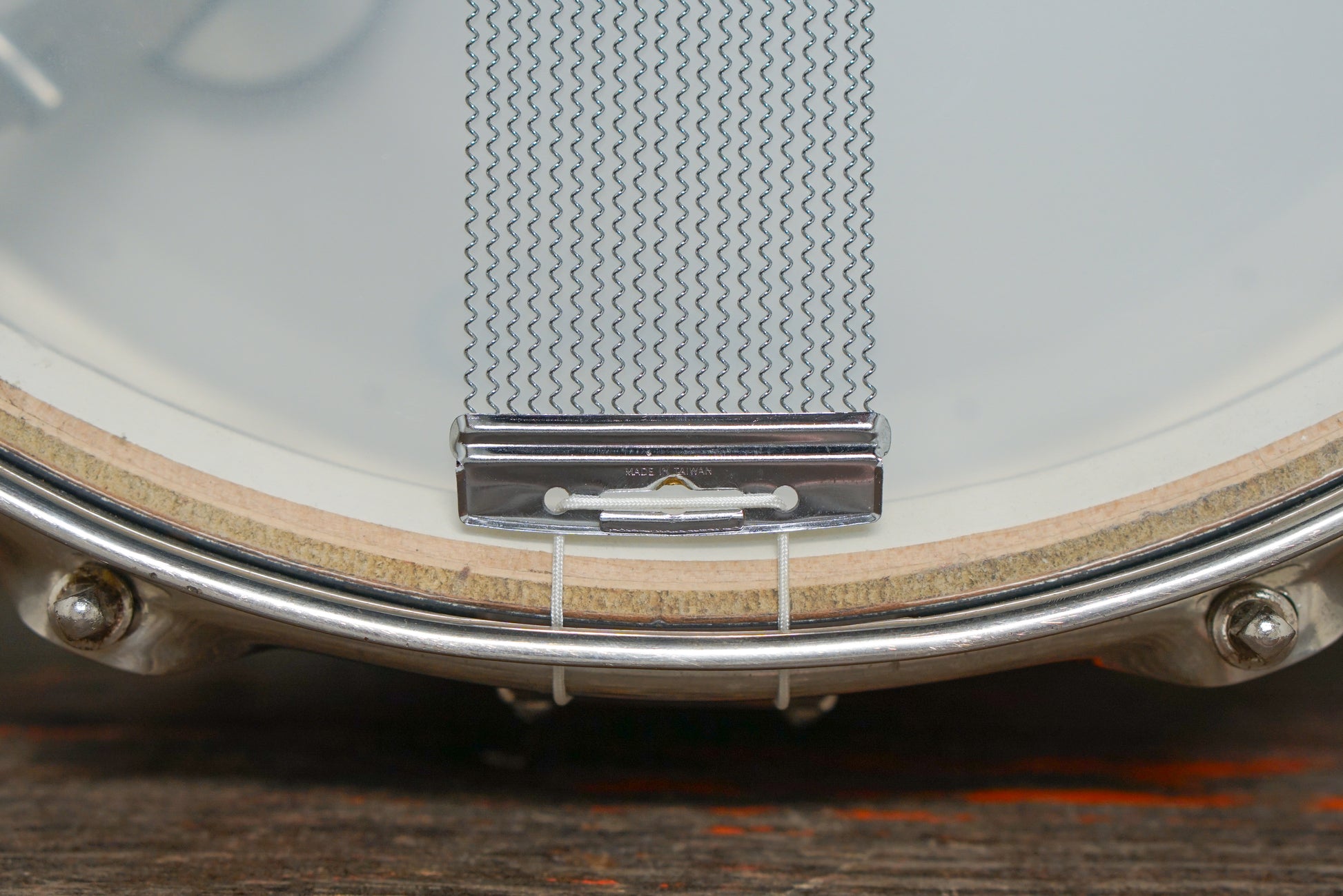 The Ludwig Jazz Festival is an iconic Ludwig snare drum, originally developed in the 1950s, and gaining in popularity throughout the '60s and early '70s. Three-ply shell with white-painted interior, eight bow-tie lugs, P83 strainer, knob-adjusted tone control, and replacement snare wires. Light pitting/surface rust on the nickel plating. A lovely drum in great working order, that sounds crisp, clean, and sensitive from the outer rim to the center of the head.