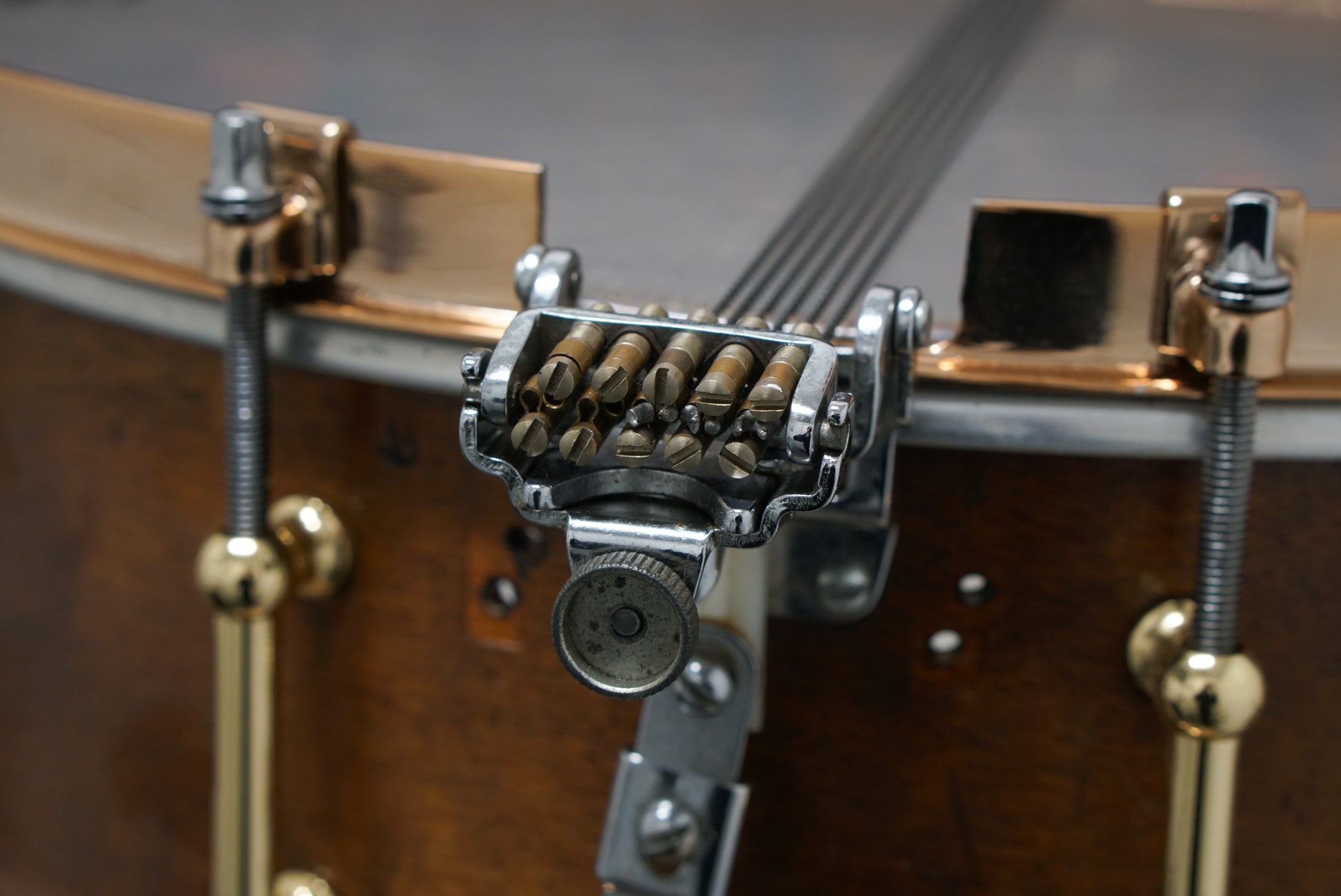 At around 100 years old, this mahogany Ludwig snare drum has a round, wet "splat", and chunky attack. It has been refinished and all new hardware has been added with ten tube lugs, claw hook tension rods, and copper plated hoops. The "Super Sensitive Strainer" is from the 70's and does have some missing wires, but is mechanically sound. The solid Ludwig shell sings and is a wonderful drum for an alternate sound in the studio, orchestra pit, or traditional jazz setting.