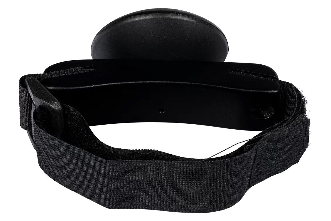 The shaker is placed at an angle on the strap to produce a short, controlled sound.