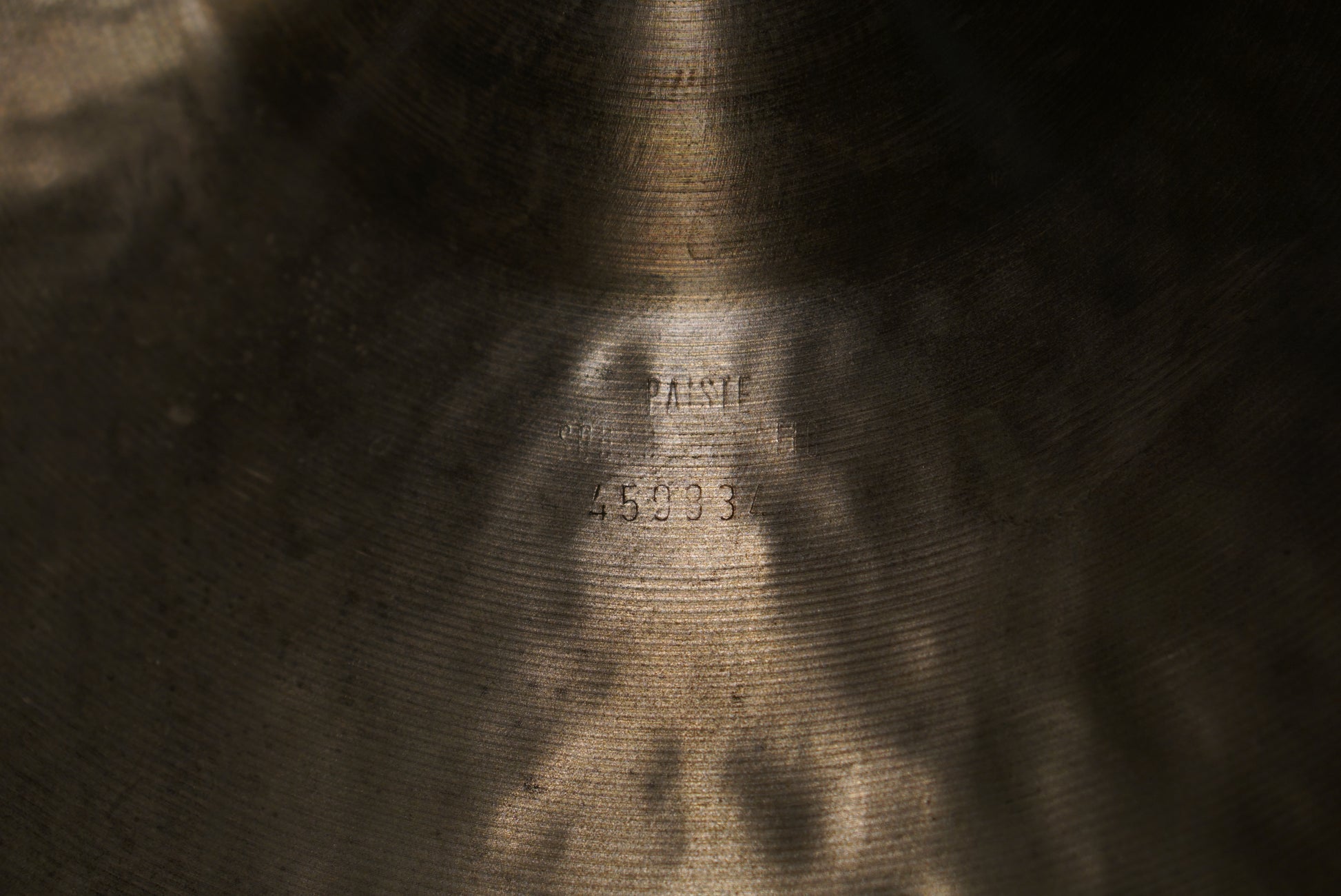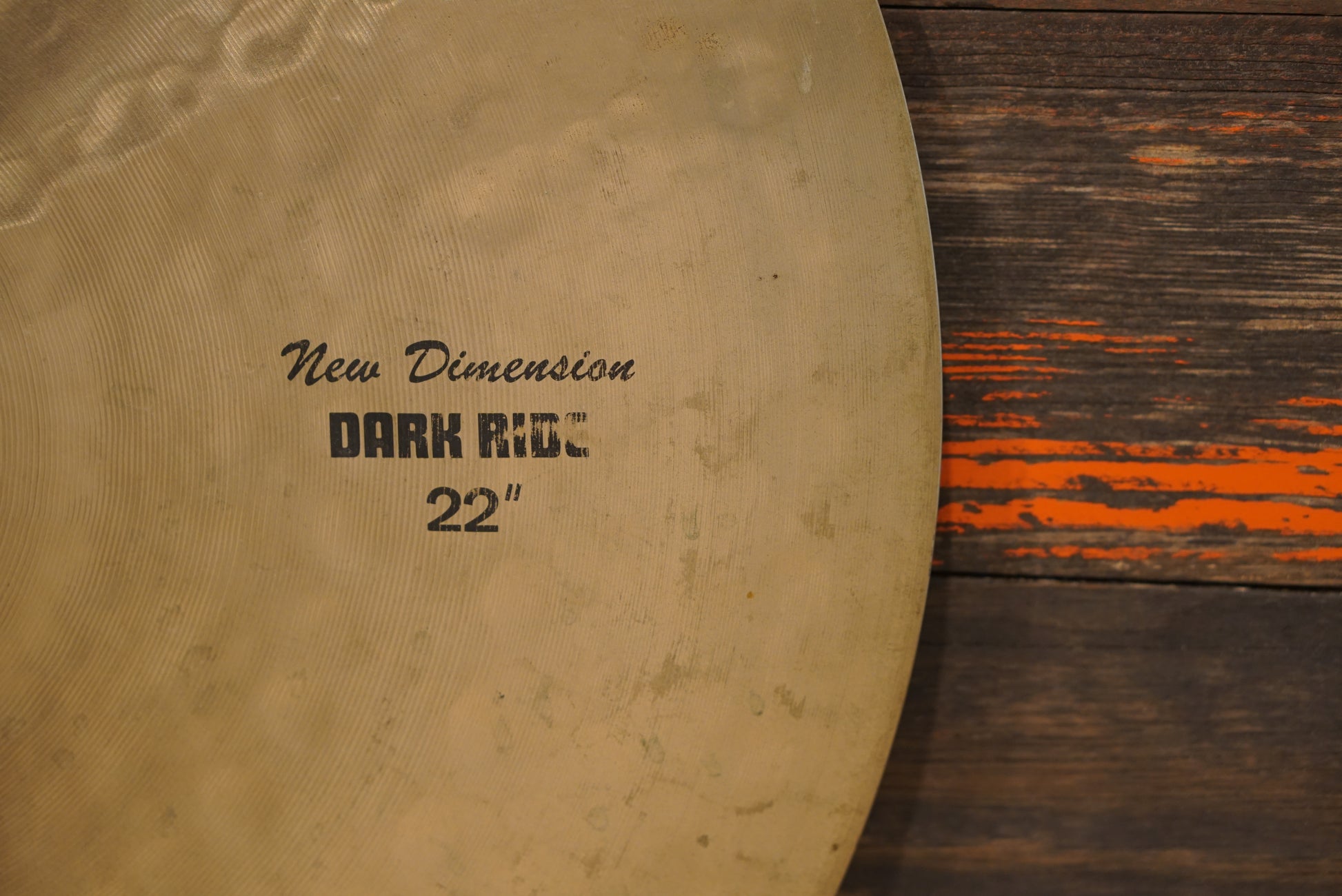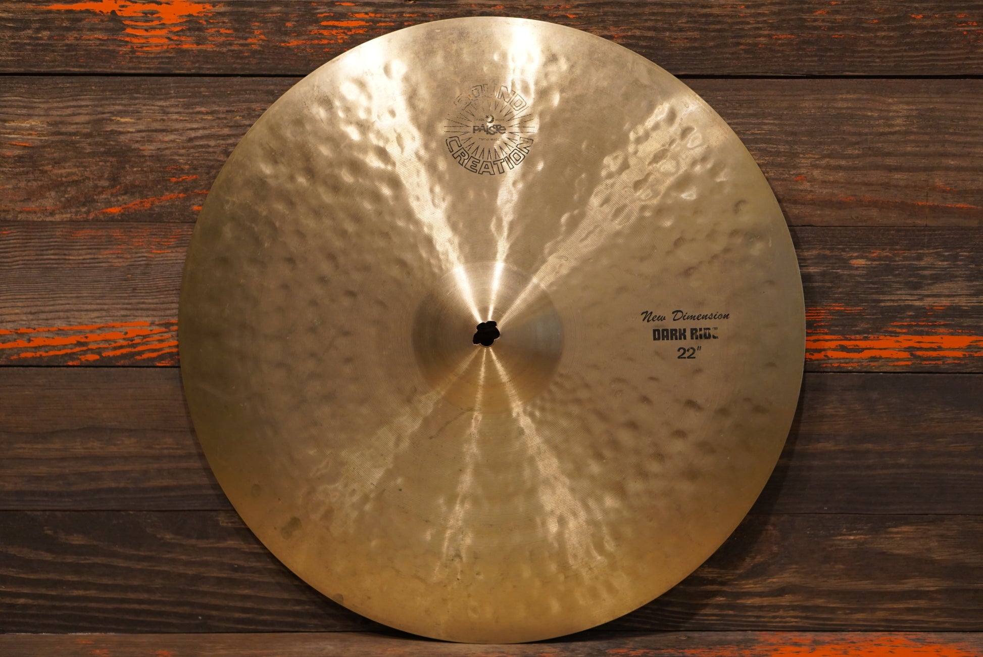 A 22" Paiste Sound Creation "New Dimension" Medium Dark Ride, dating to 1984. Weight is 3130 grams. Strong in the midrange, with a glassy stick attack, and overall somewhat striated wash and clangy bell. Unfortunately this cymbal has significant damage at the mounting hole, which seems stable, but could be reinforced with a large grommet for easier mounting.