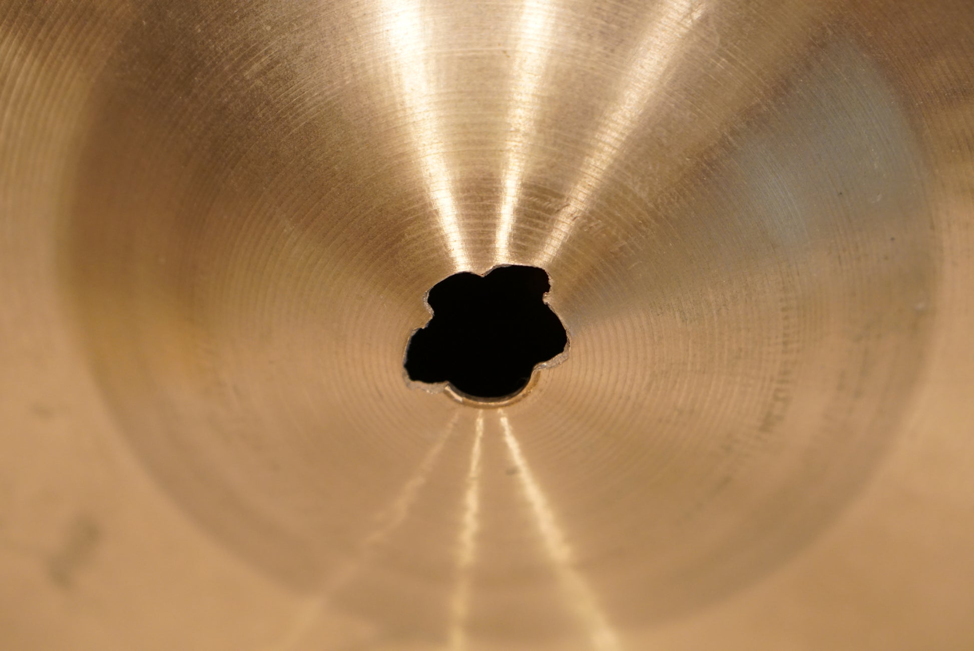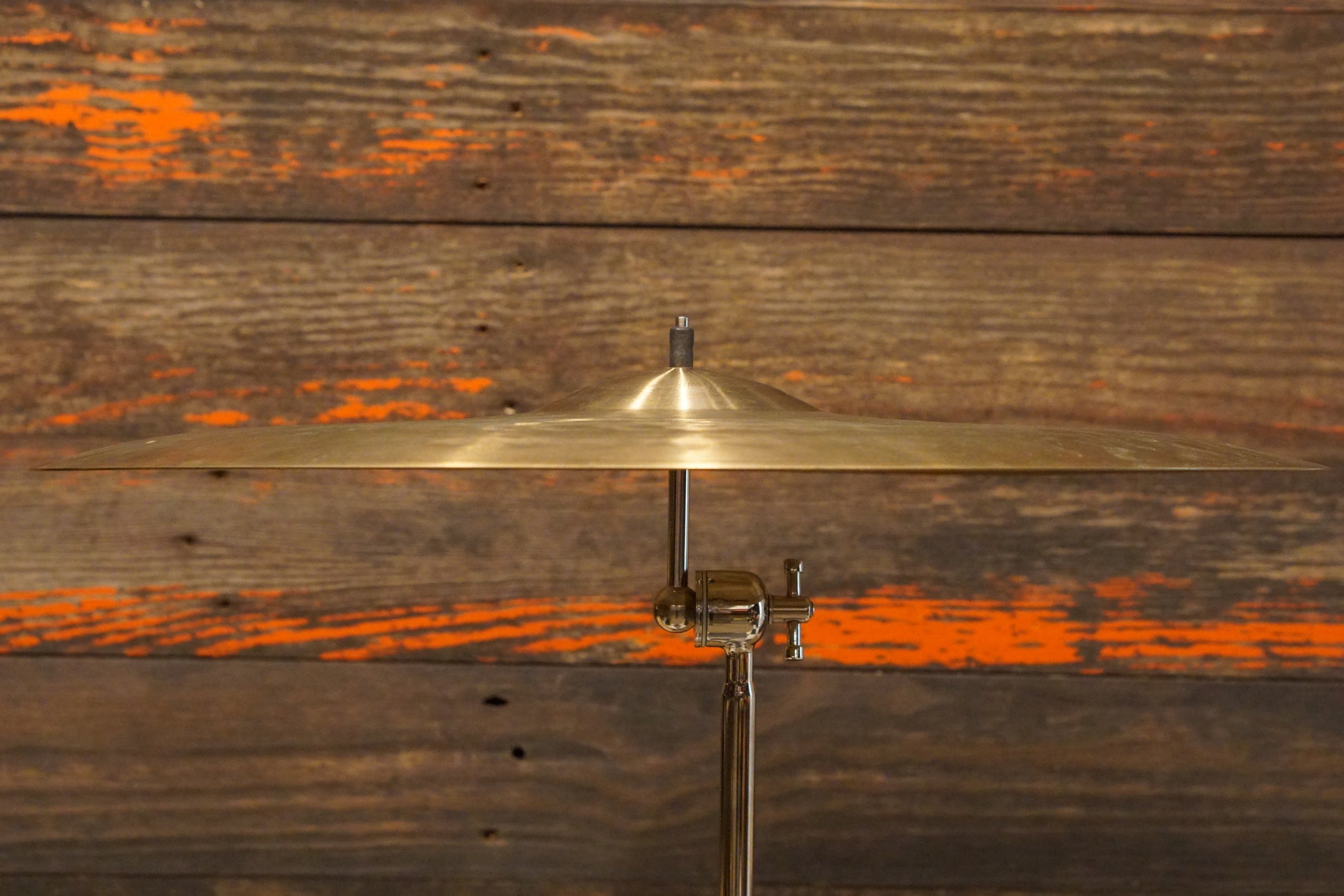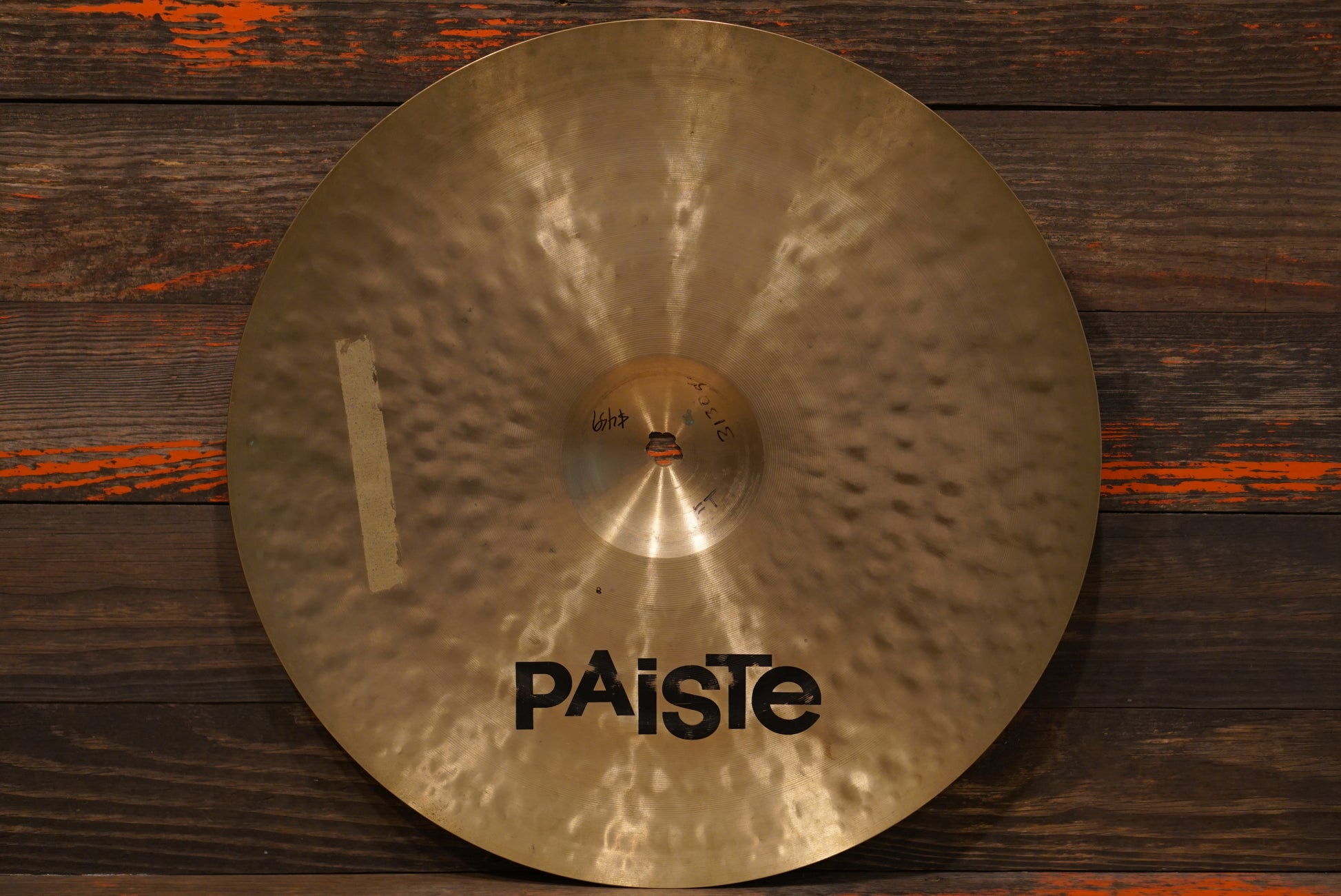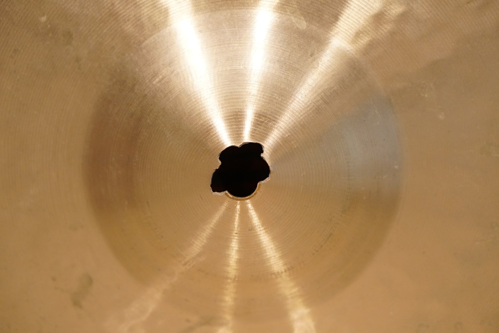 A 22" Paiste Sound Creation "New Dimension" Medium Dark Ride, dating to 1984. Weight is 3130 grams. Strong in the midrange, with a glassy stick attack, and overall somewhat striated wash and clangy bell. Unfortunately this cymbal has significant damage at the mounting hole, which seems stable, but could be reinforced with a large grommet for easier mounting.