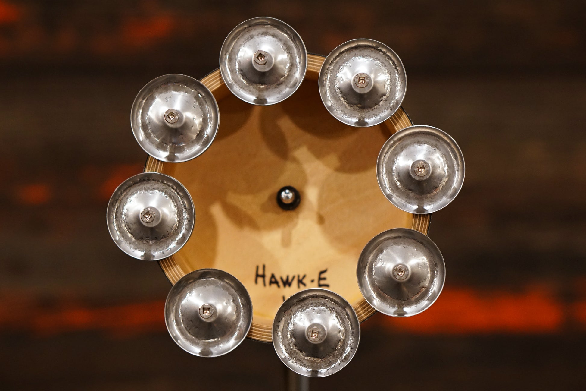 The Hawk-E is a unique percussion instrument that can be mounted using a hi-hat clutch, on a cymbal sleeve (up to 8mm), or used in any other way your imagination can conjure! High-quality plywood frame with eight double sets of Black Swamp Stainless Steel Jingles.