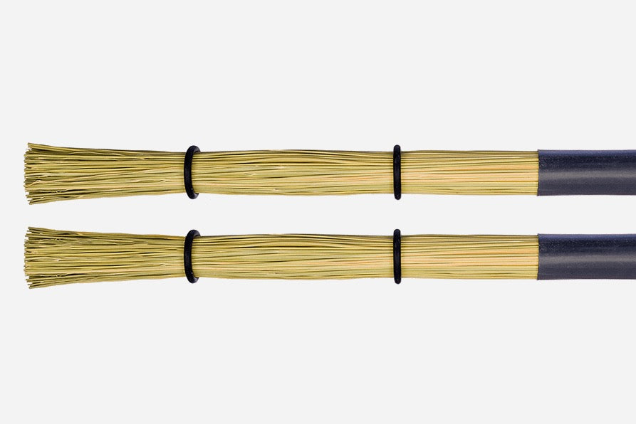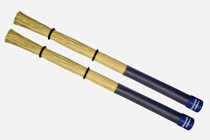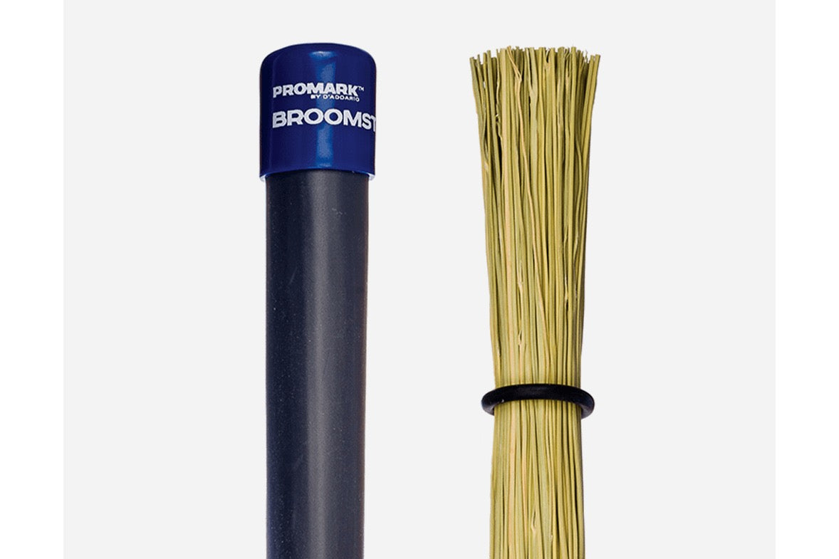 The ProMark Broomsticks are a hybrid between a brush and a rod, offering greater volume than brushes, and less attack than rods. This alternate sound source is most like a traditional drumstick, containing an adjustable O-ring that allows the player to change the spread of the bristles.