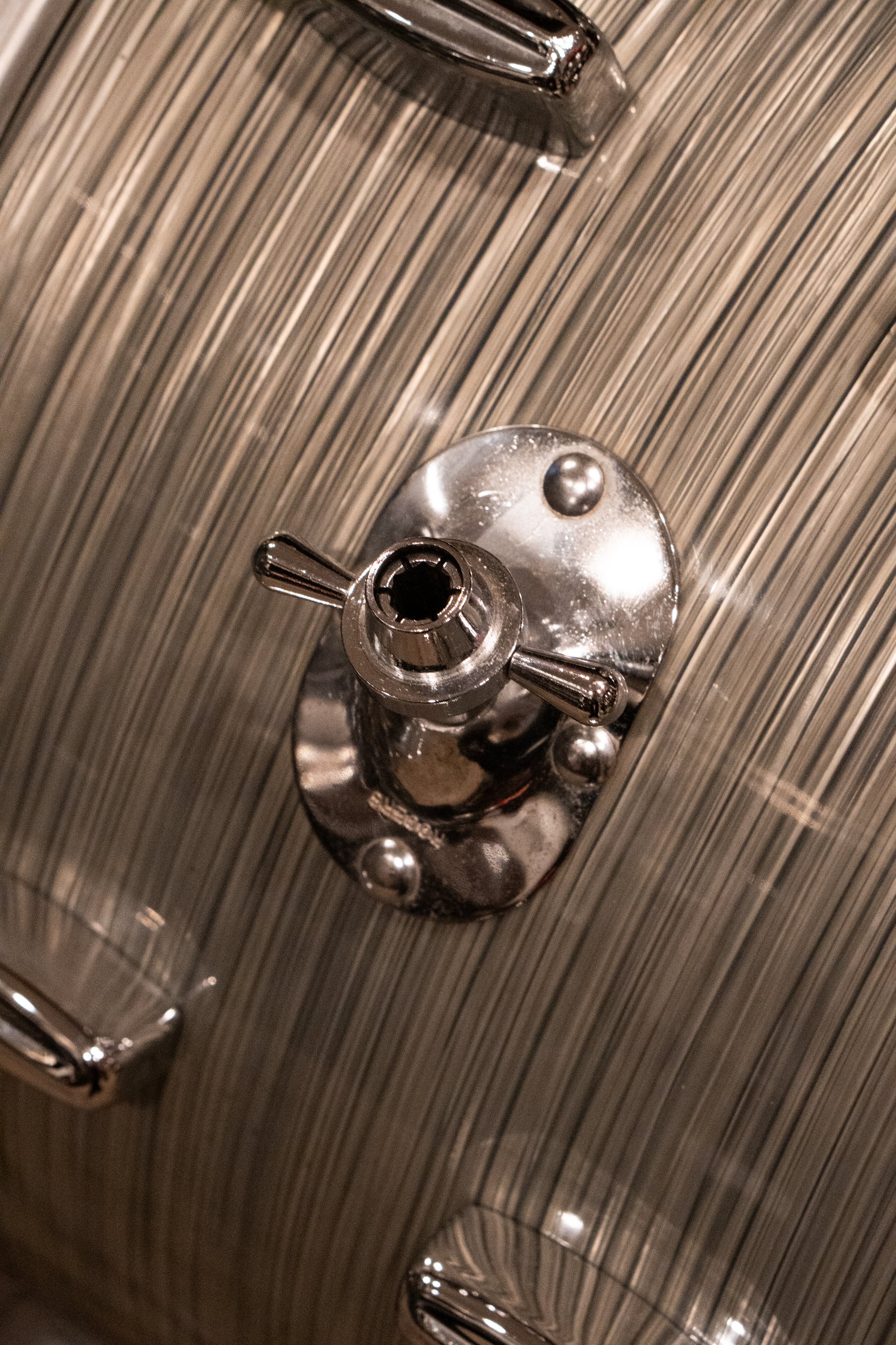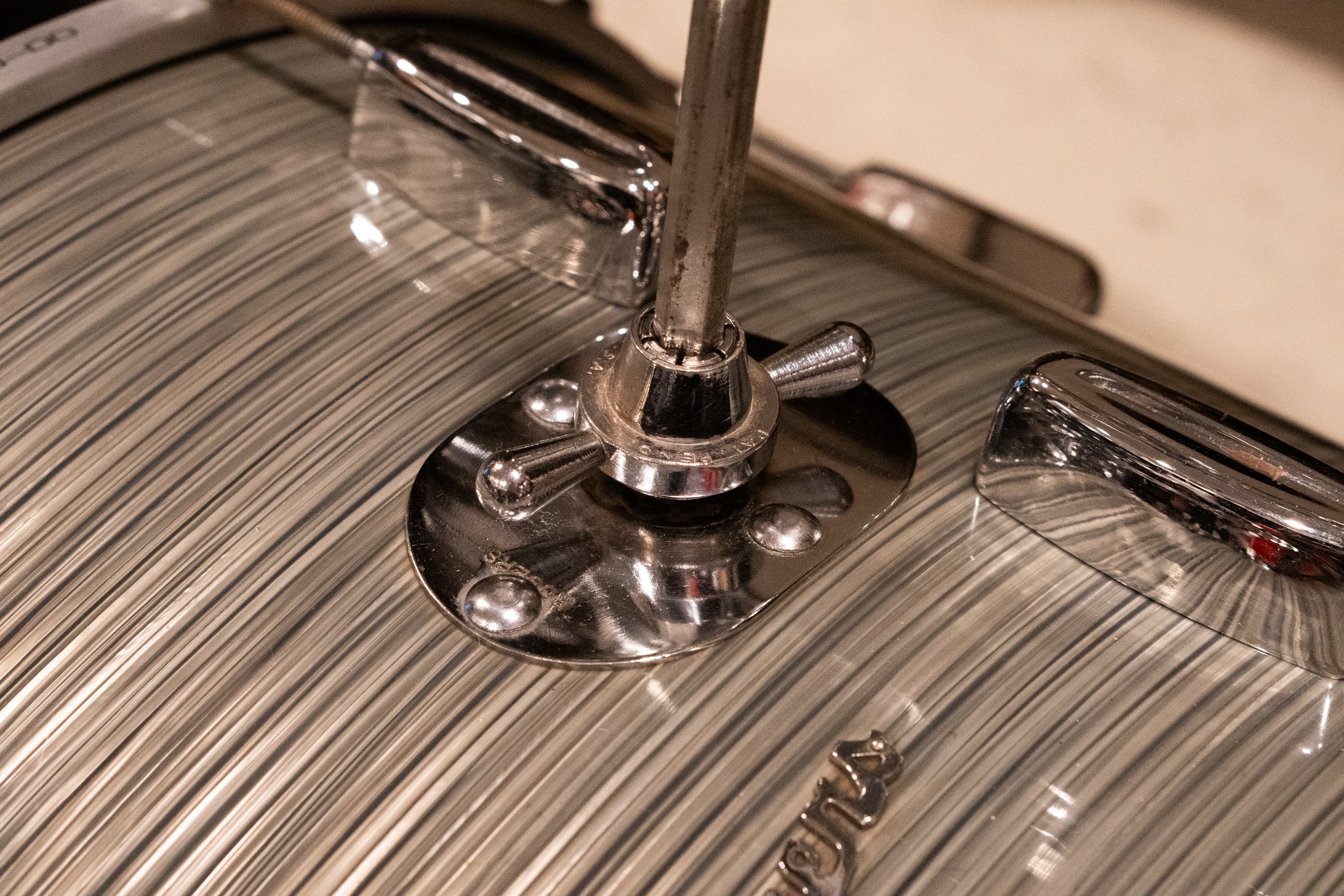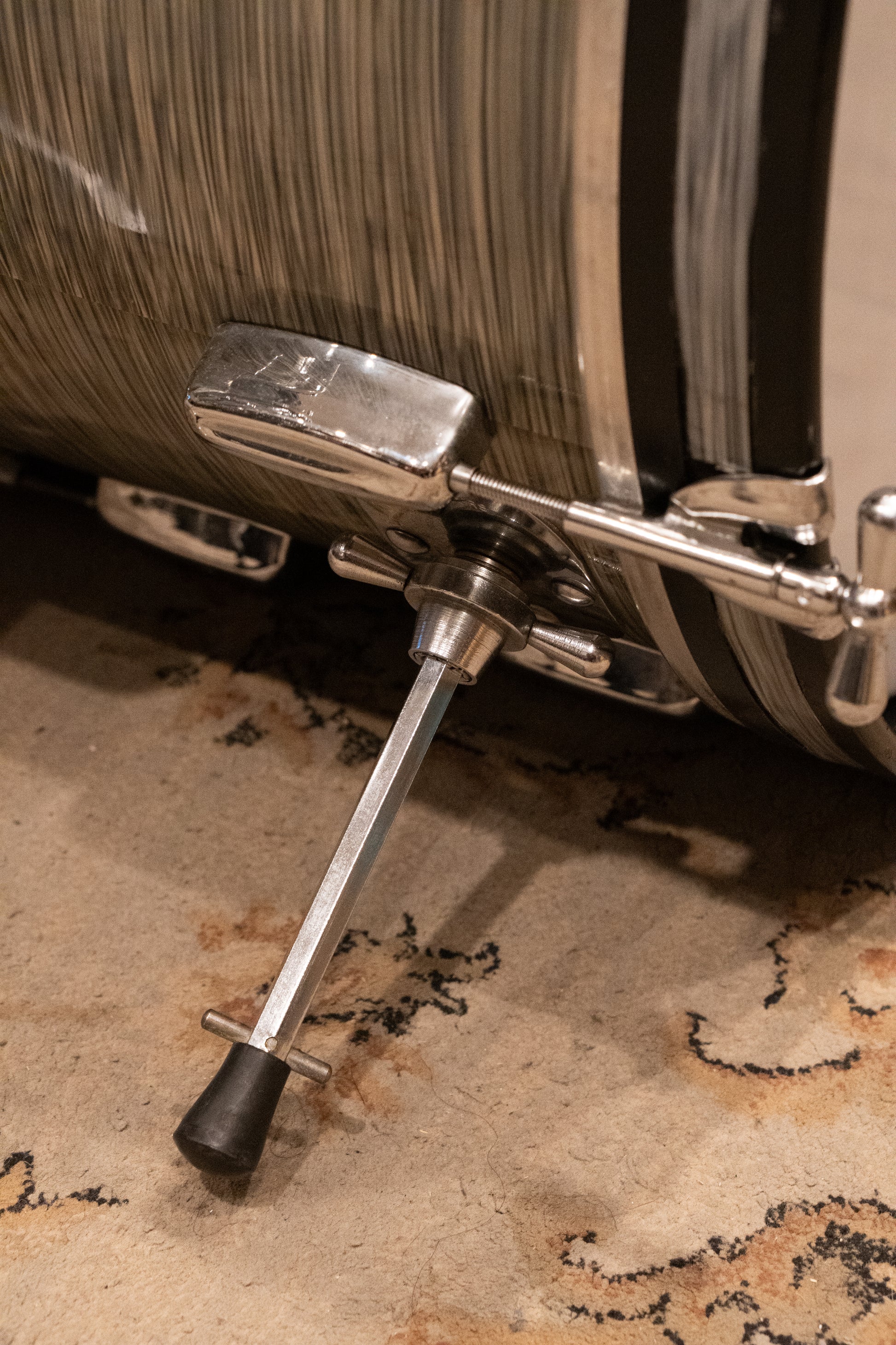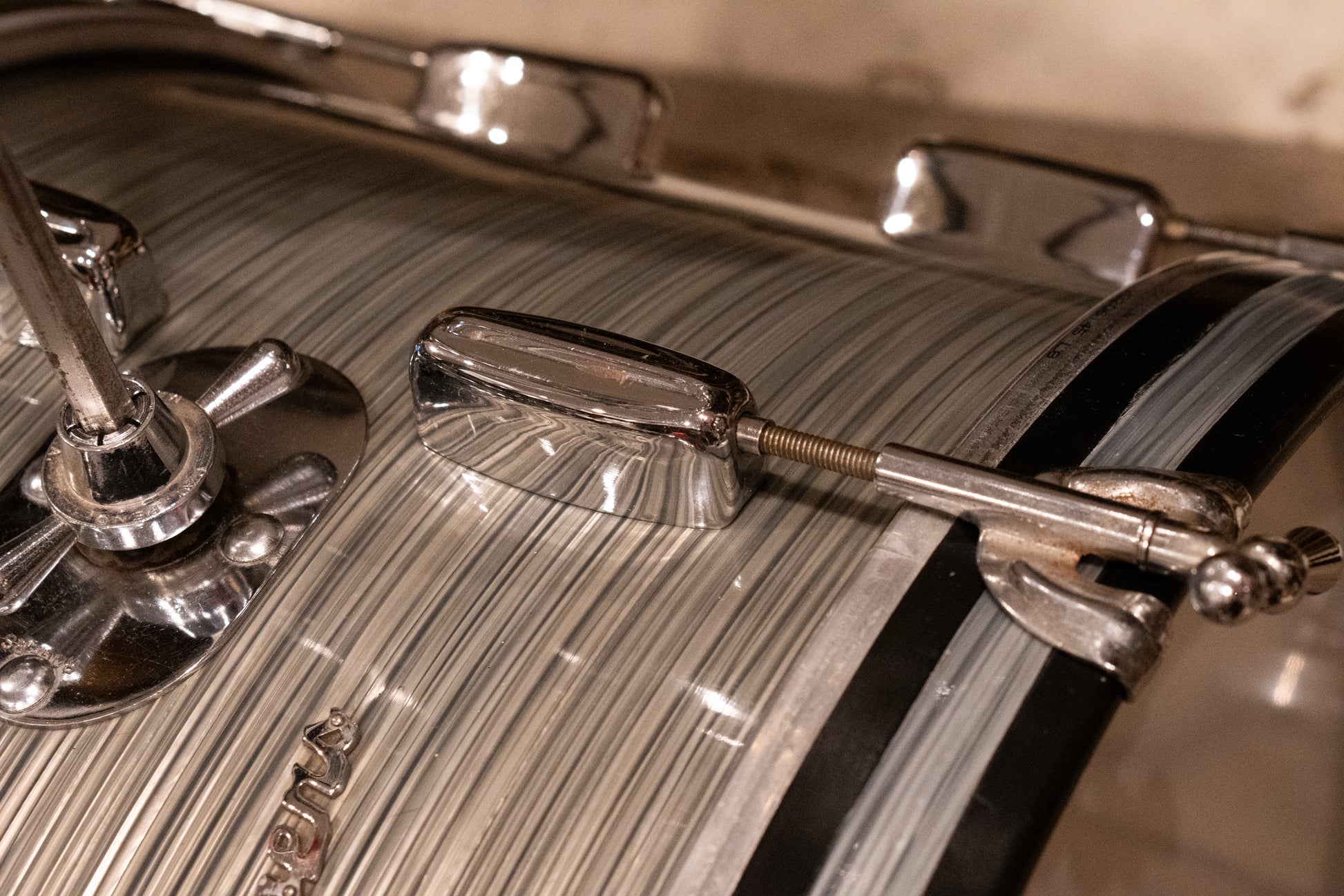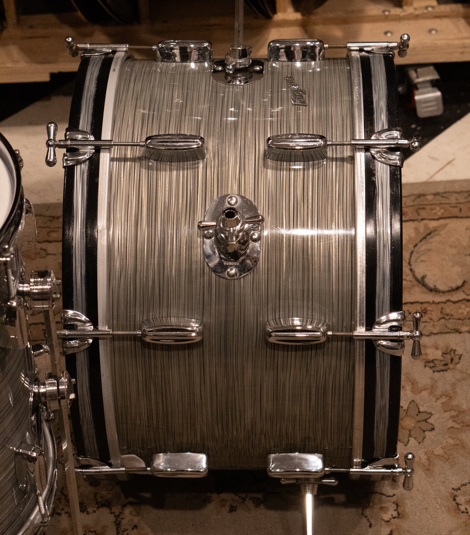 What a kit! Rare, 1960s era Bread and Butter lugged Rogers kit in Steel Grey Ripple Pearl. 14x20, 8x12, 14x14, and matching 5x14 Snare. All the drums have original bread & butter lugs (that have been reinforced) along with original tall brass hoops, with flat grey interiors, and Cleveland tags - all drums are designated as "Holiday". The shells are the earlier 60's 3ply with re-rings and shallow edges. Great condition for age, with a little wear on finish or hardware. Floor tom has additional collets for extra accessory mounting, original to the kit. Some of the wrap near the lug casings is pulled up slightly, towards the bearing edge and is mostly noticeable up close This kit is a pure delight to play; a focused and airy resonance only found in B&B lug kits, with a quick decay and a centered, clear, round tone and attack. These drums like to be hit and will be all-stars in a wide variety of musical situations.