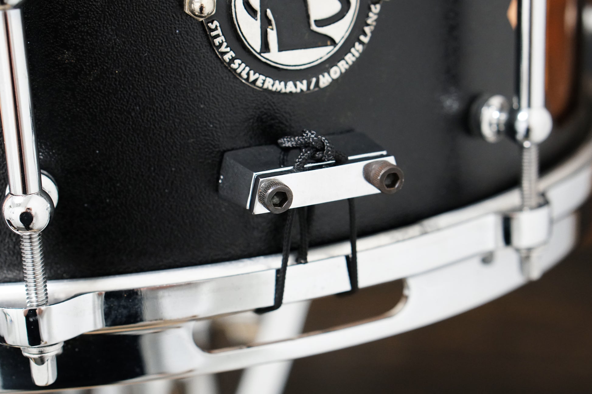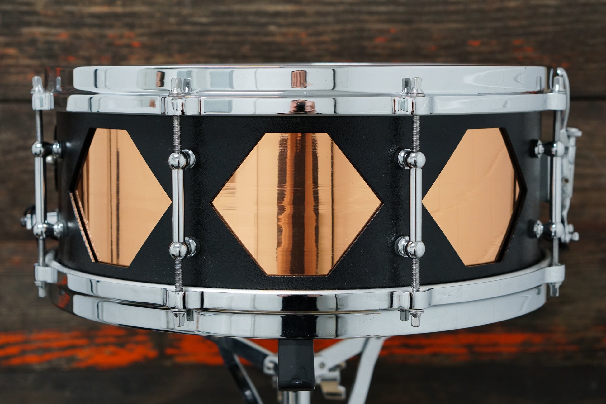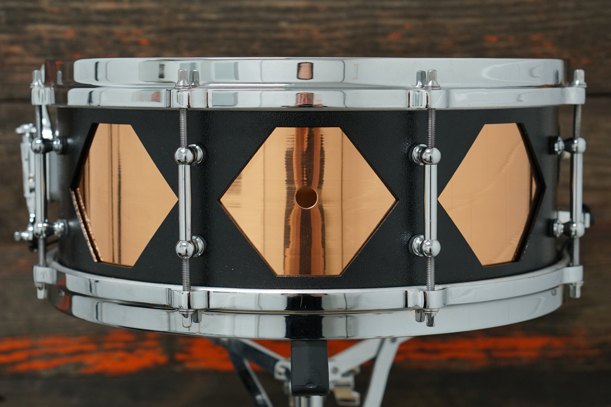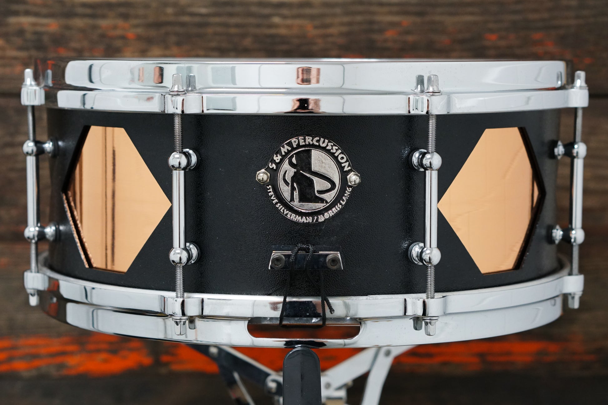 A unique and very cool snare made by Steve Silverman and Morris Lang. 6x14" Timpani Copper shell wrapped in cutout heavy black vinyl. Eight tube lugs, die-cast hoops, and 30-strand Puresound snare wires. In great condition—overall very clean.