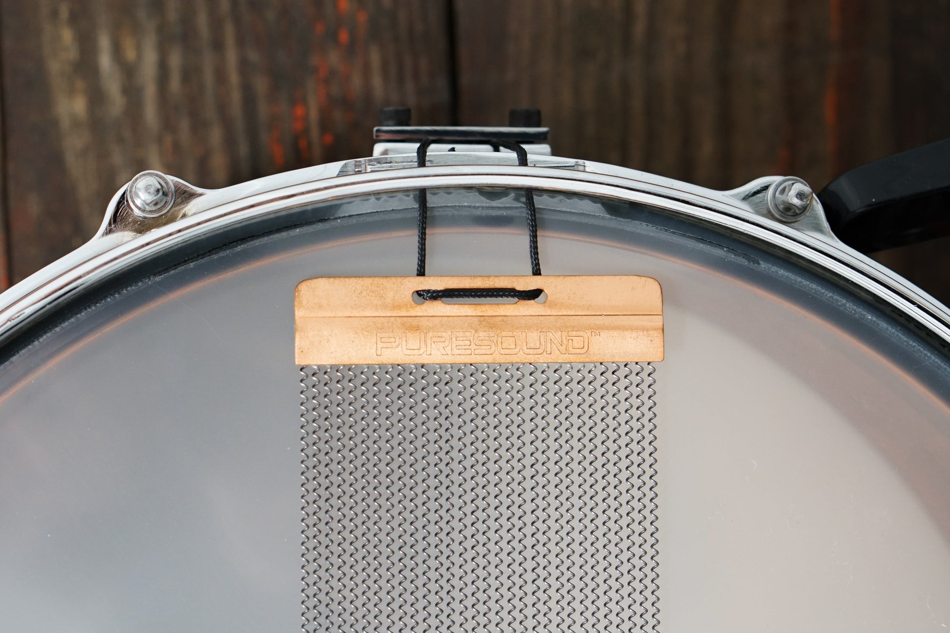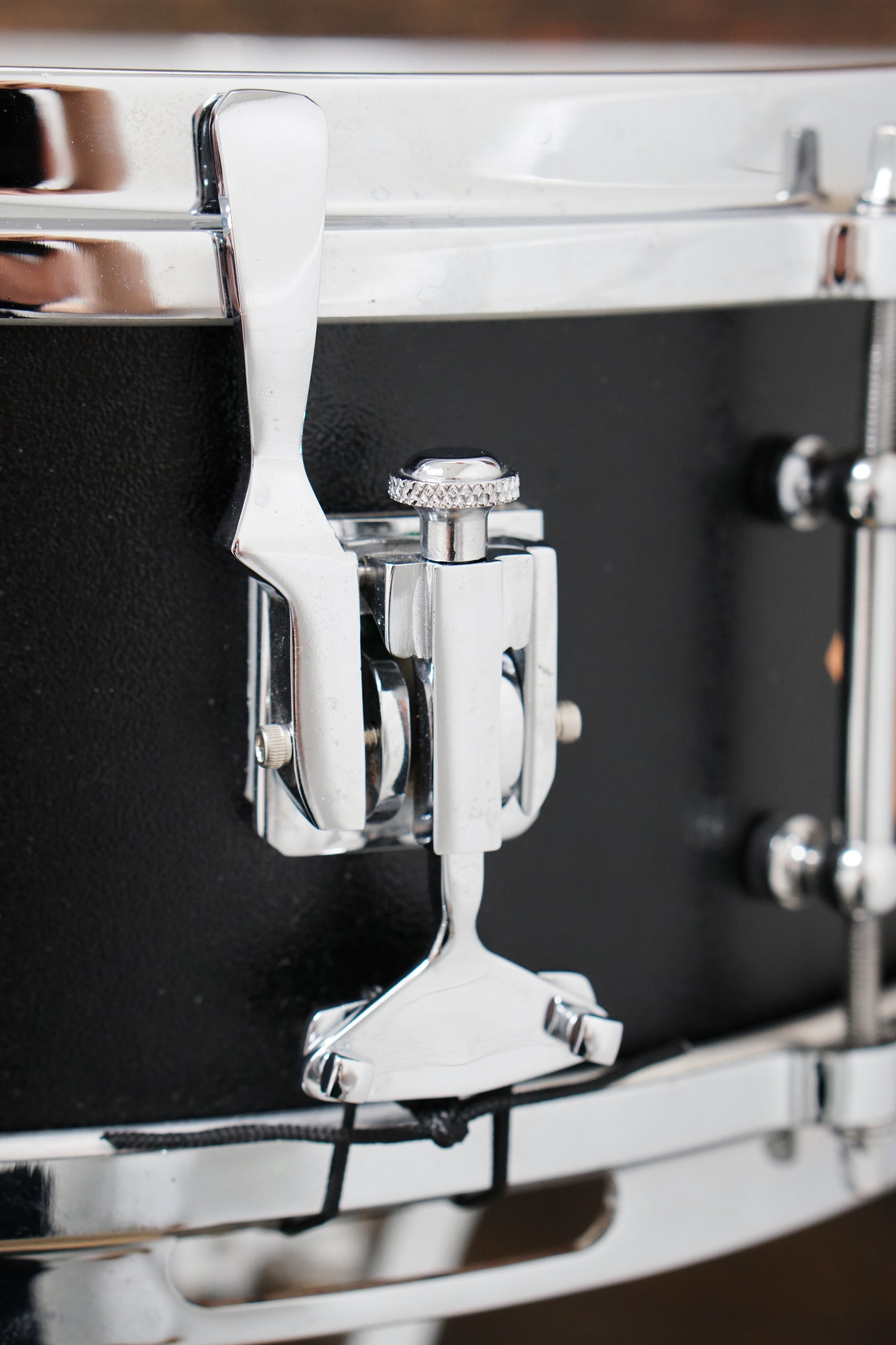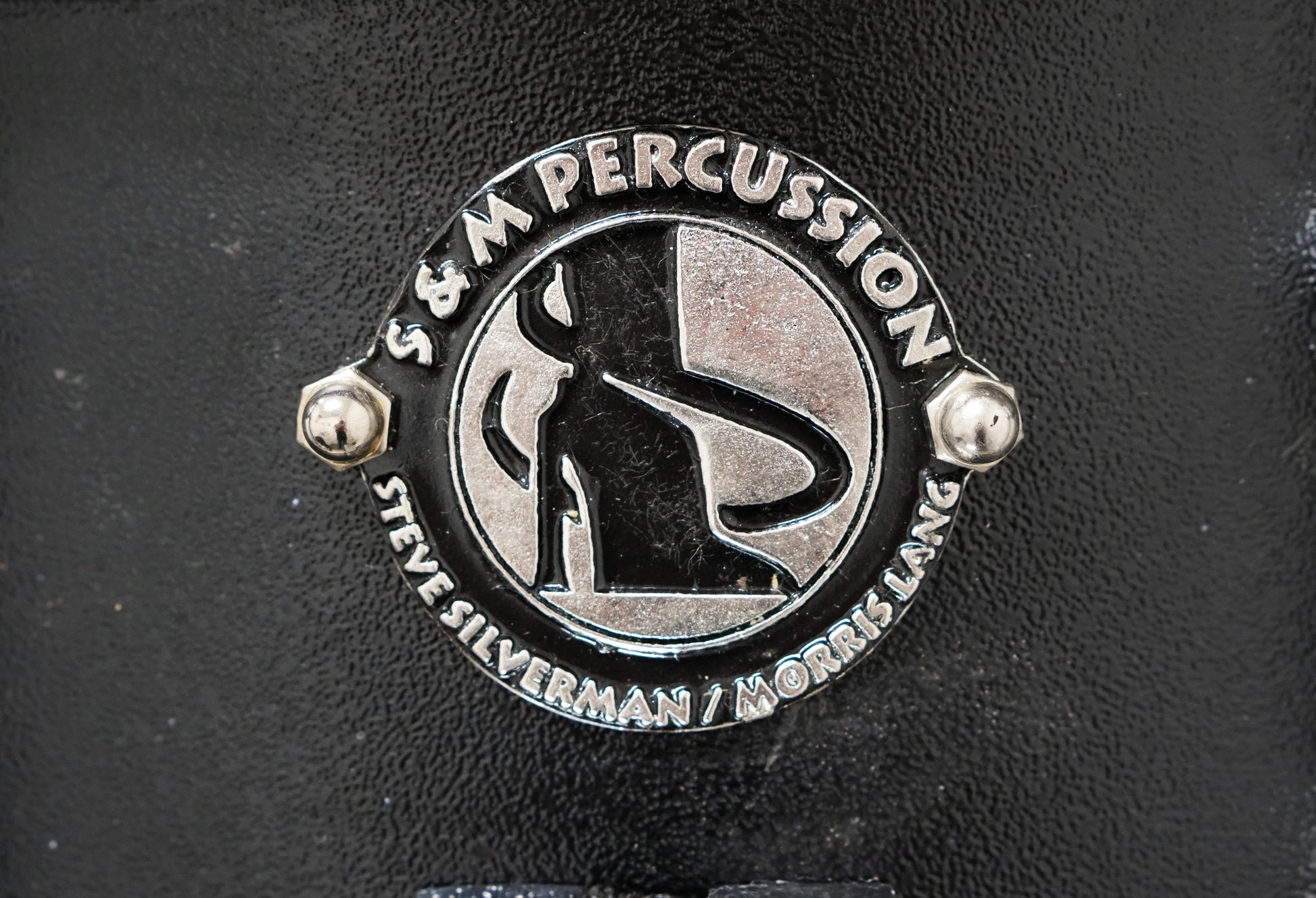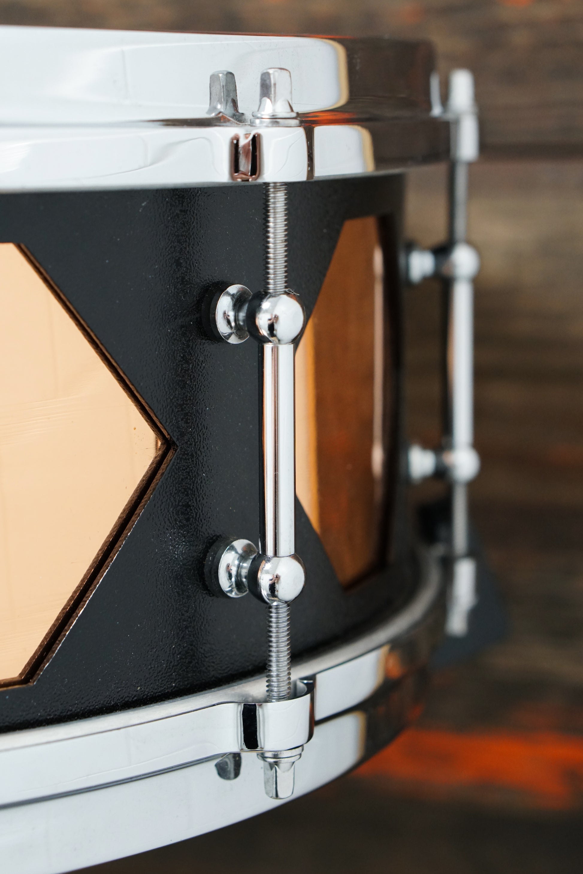 A unique and very cool snare made by Steve Silverman and Morris Lang. 6x14" Timpani Copper shell wrapped in cutout heavy black vinyl. Eight tube lugs, die-cast hoops, and 30-strand Puresound snare wires. In great condition—overall very clean.