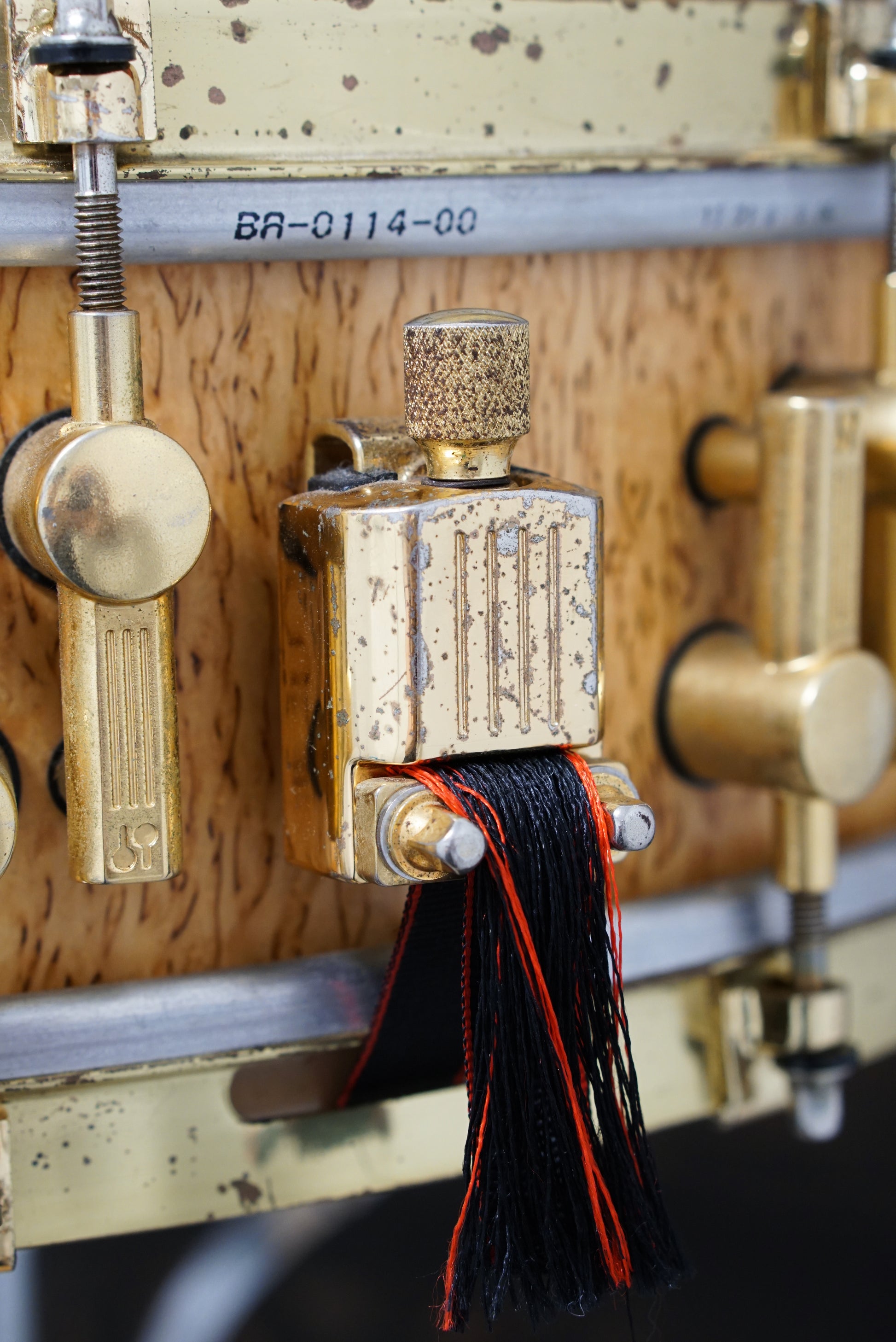 A delightful Sonor drum from the 2010s. Wet and punchy with a delicious "splat". Moderate pitting and tarnish on the plating, and a Trick throw-off has been installed.