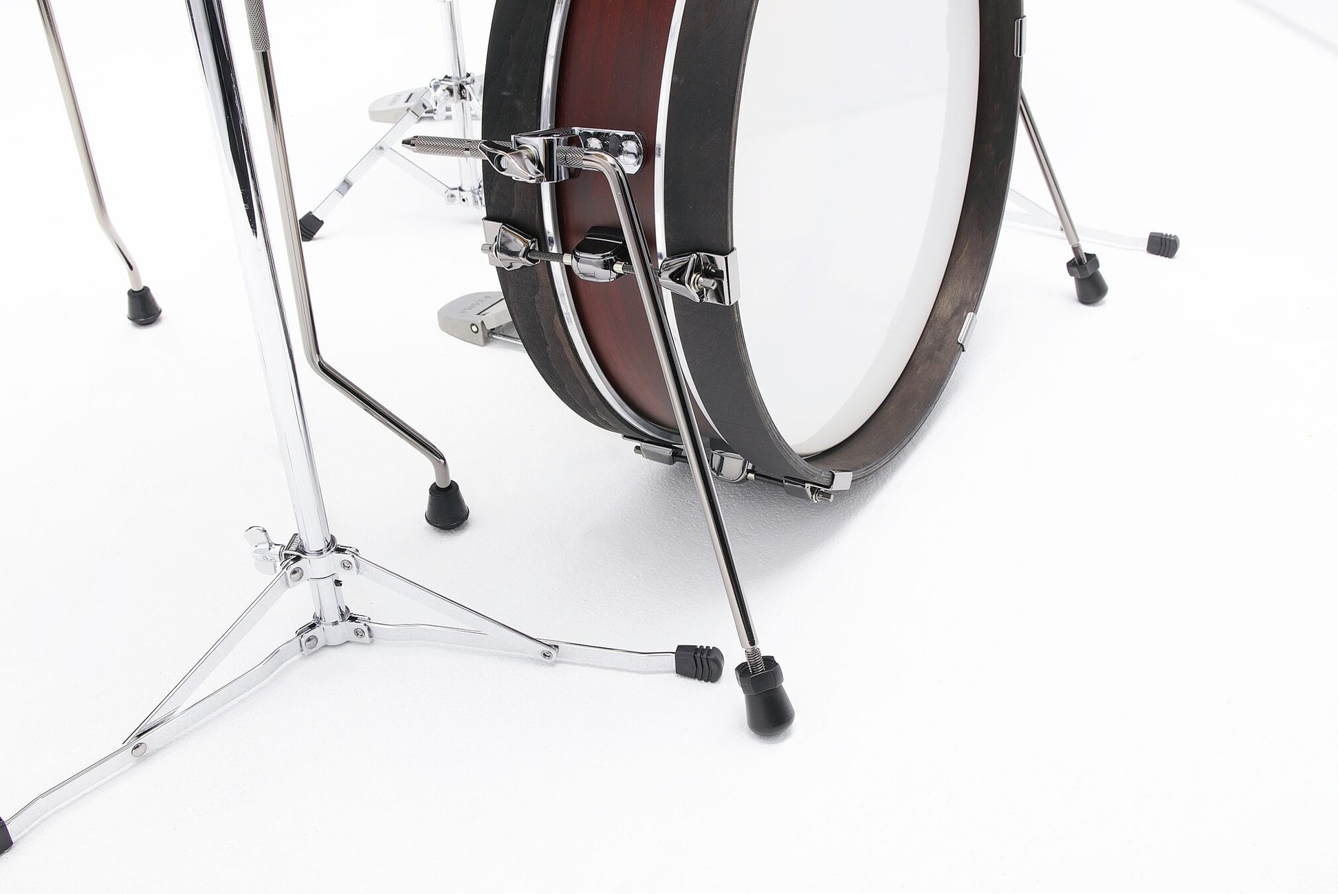The 3.5" deep tom and floor tom, paired with a 4" deep snare drum and bass drum can be easily packed in just a single bag (sold separately) thanks to the ultra-shallow shell. The single-headed toms produce a crisp and warm sound with a strong attack. The double-headed snare drum produces a bright and sharp sound, along with significant low-end from the double-headed bass drum.