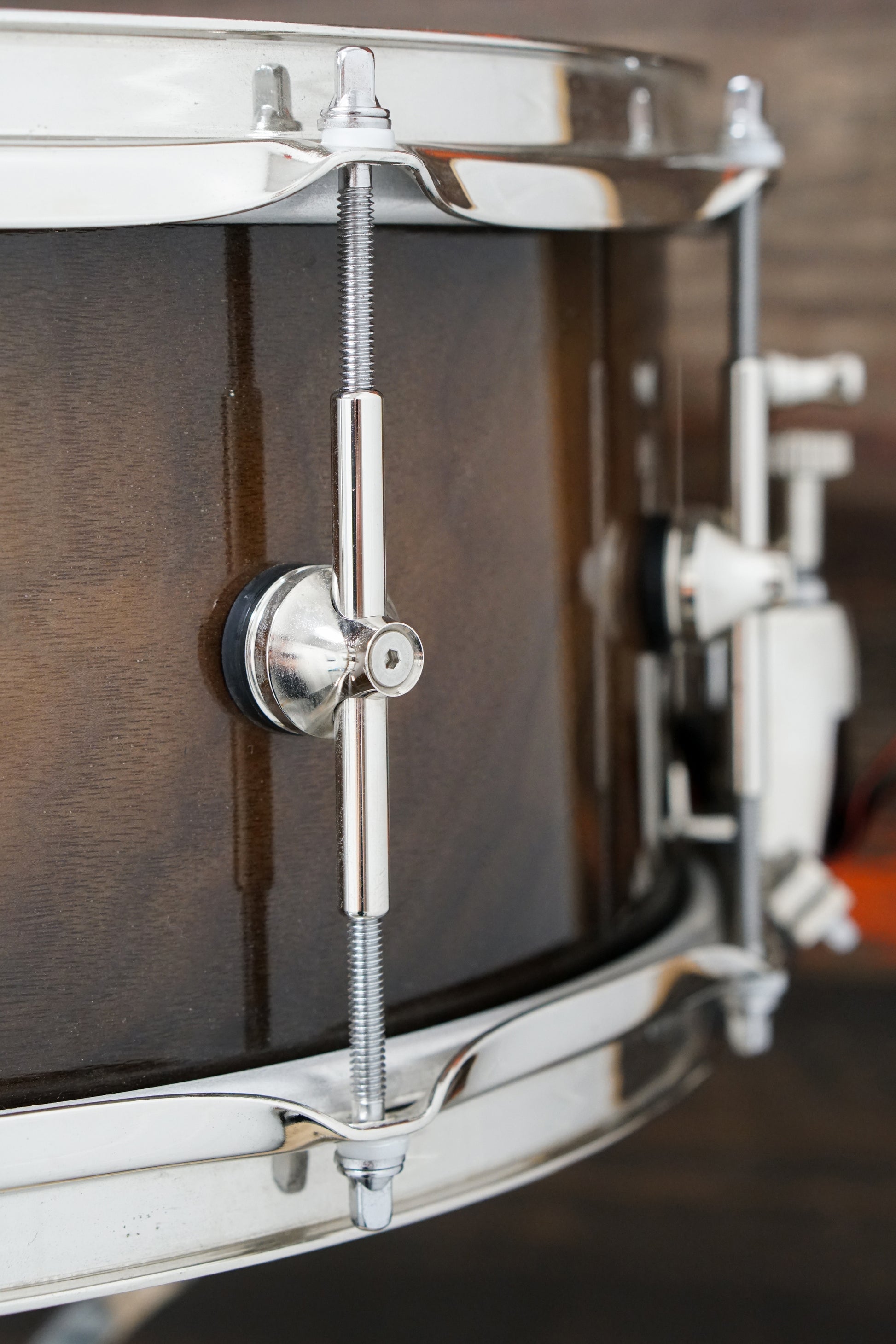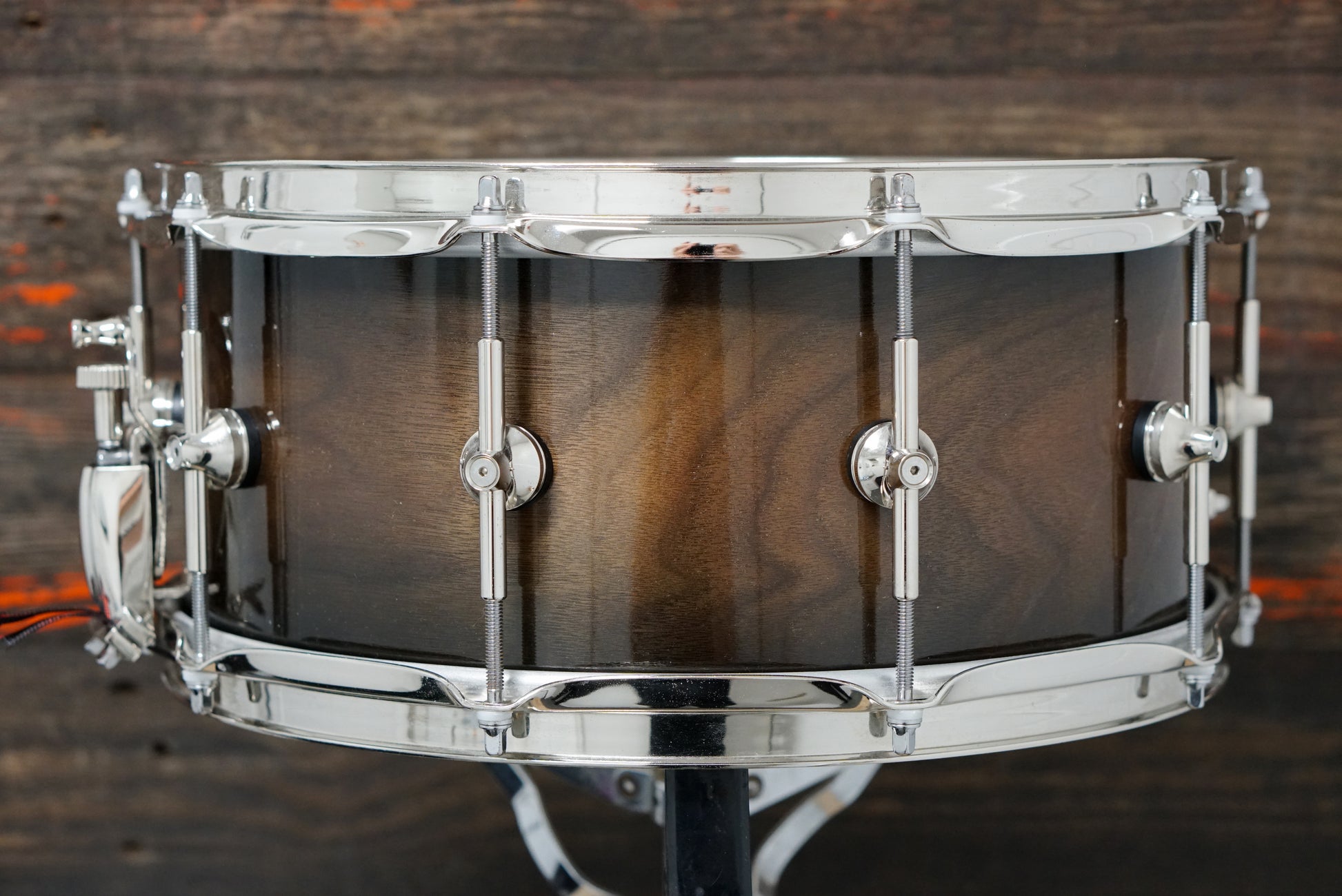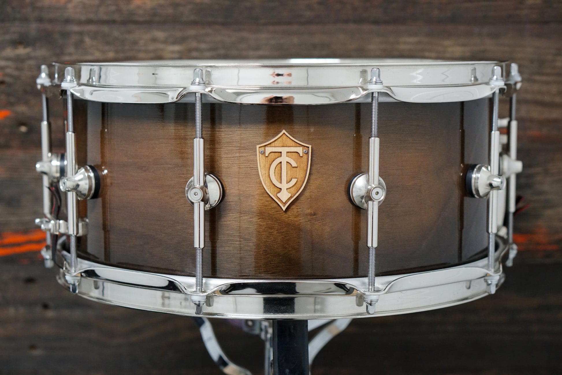 A beautiful, gently-used Walnut snare drum from Twin Cities Drum Collective. Ply shell with ten single-node tube lugs, triple-flanged hoop, and Gibraltar throw-off. Dry with a blocky front edge and plenty of dark "ping".
