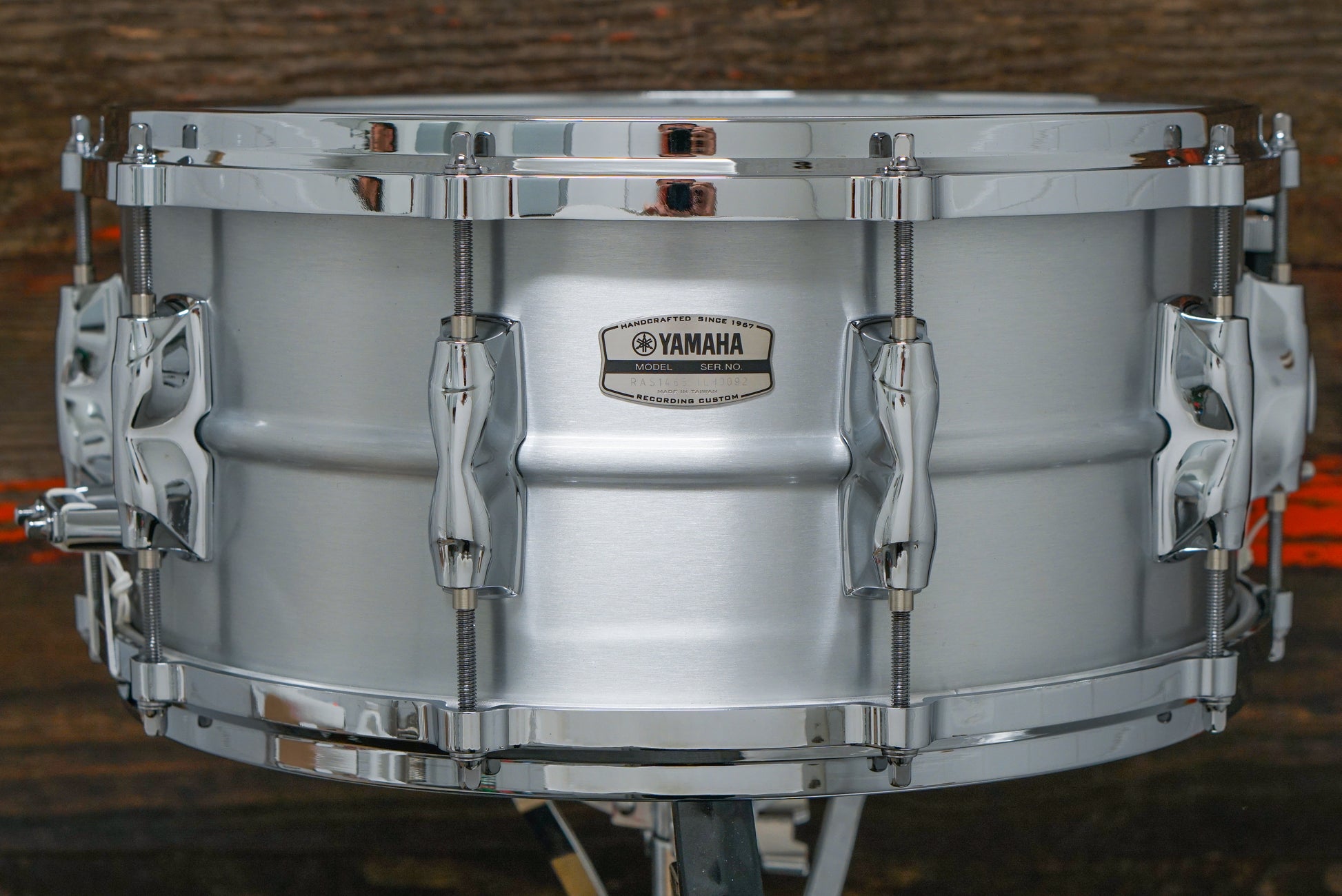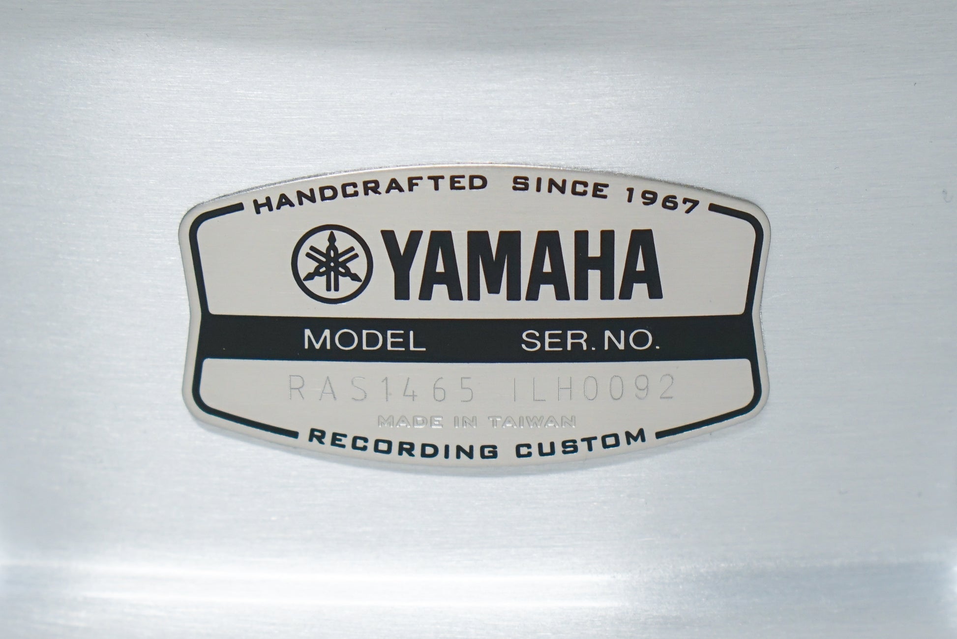 A brand new Yamaha Recording Custom Aluminum snare drum, featuring a 1.2mm aluminum shell and designed with Steve Gadd. The model number RAS 1465 signifies a 25 strand snare wire.