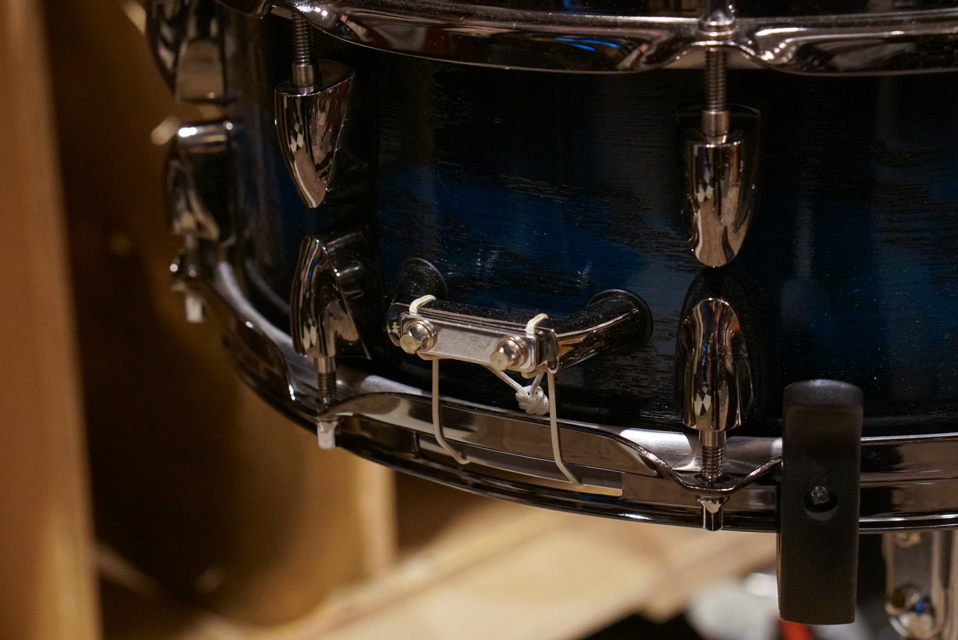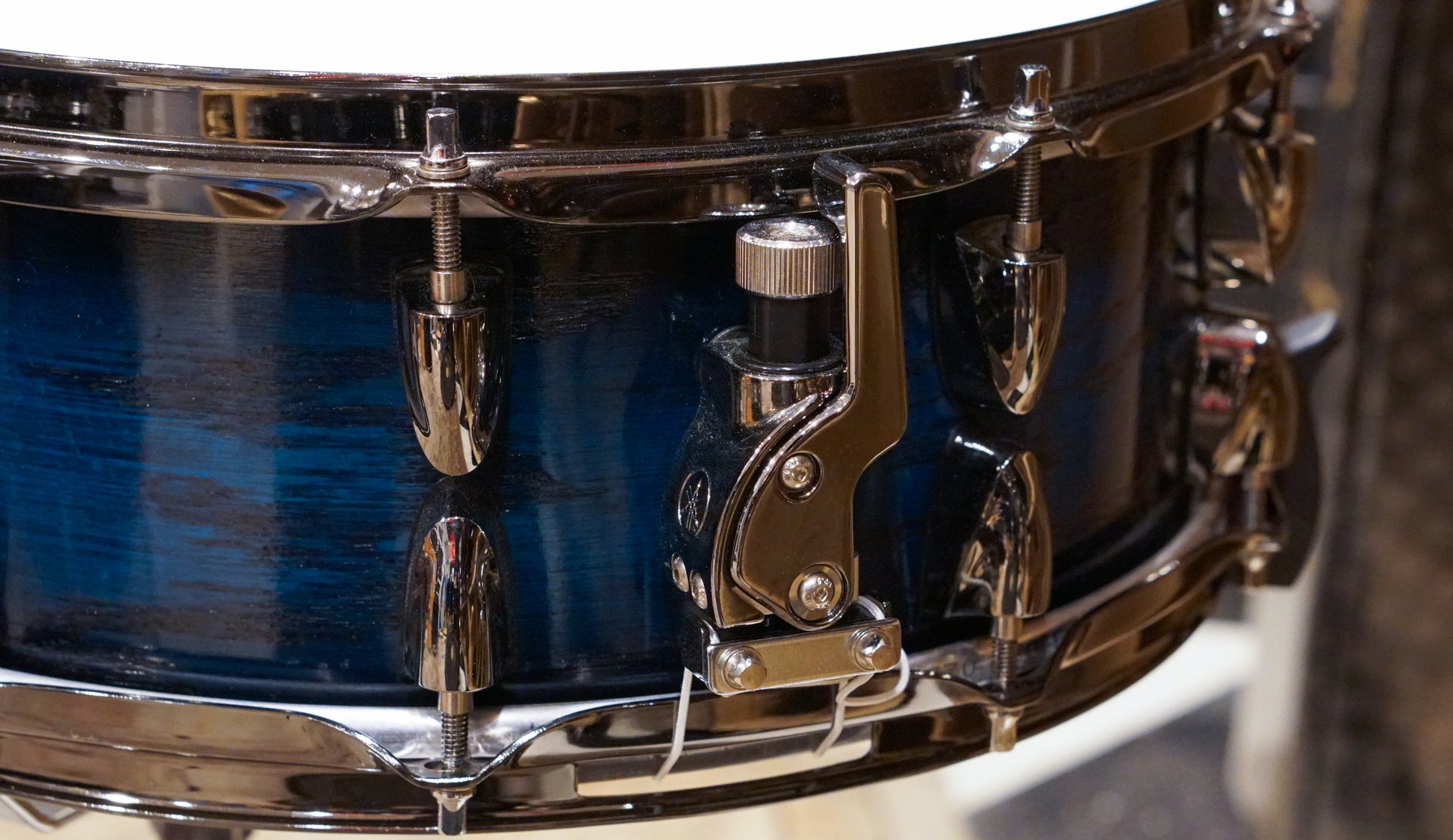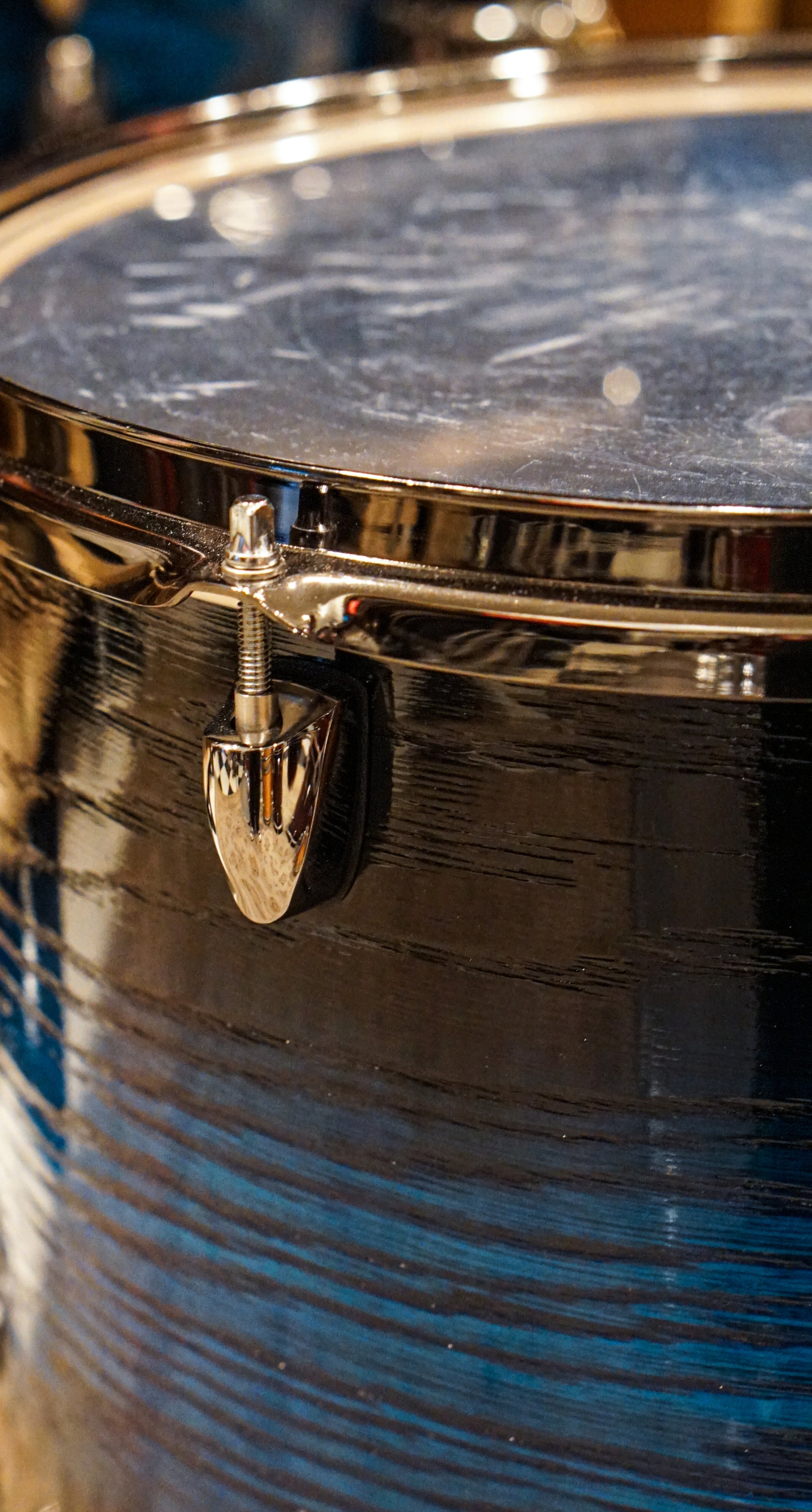 The traditional Japanese finishing technique known as uzukuri has been modified for use on drum shells. In this procedure, the soft areas in the wood grain are sanded and the entire shell is coated with a thin layer of black paint. The surface of the shell is sanded again before the final coating is applied in a process that emphasizes the natural beauty of the oak grain."