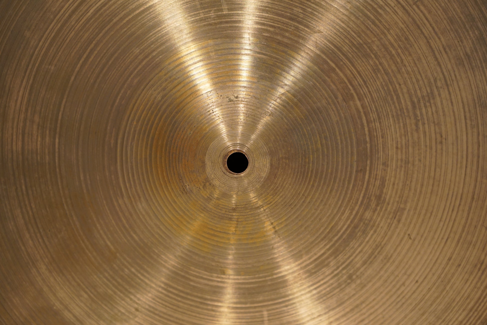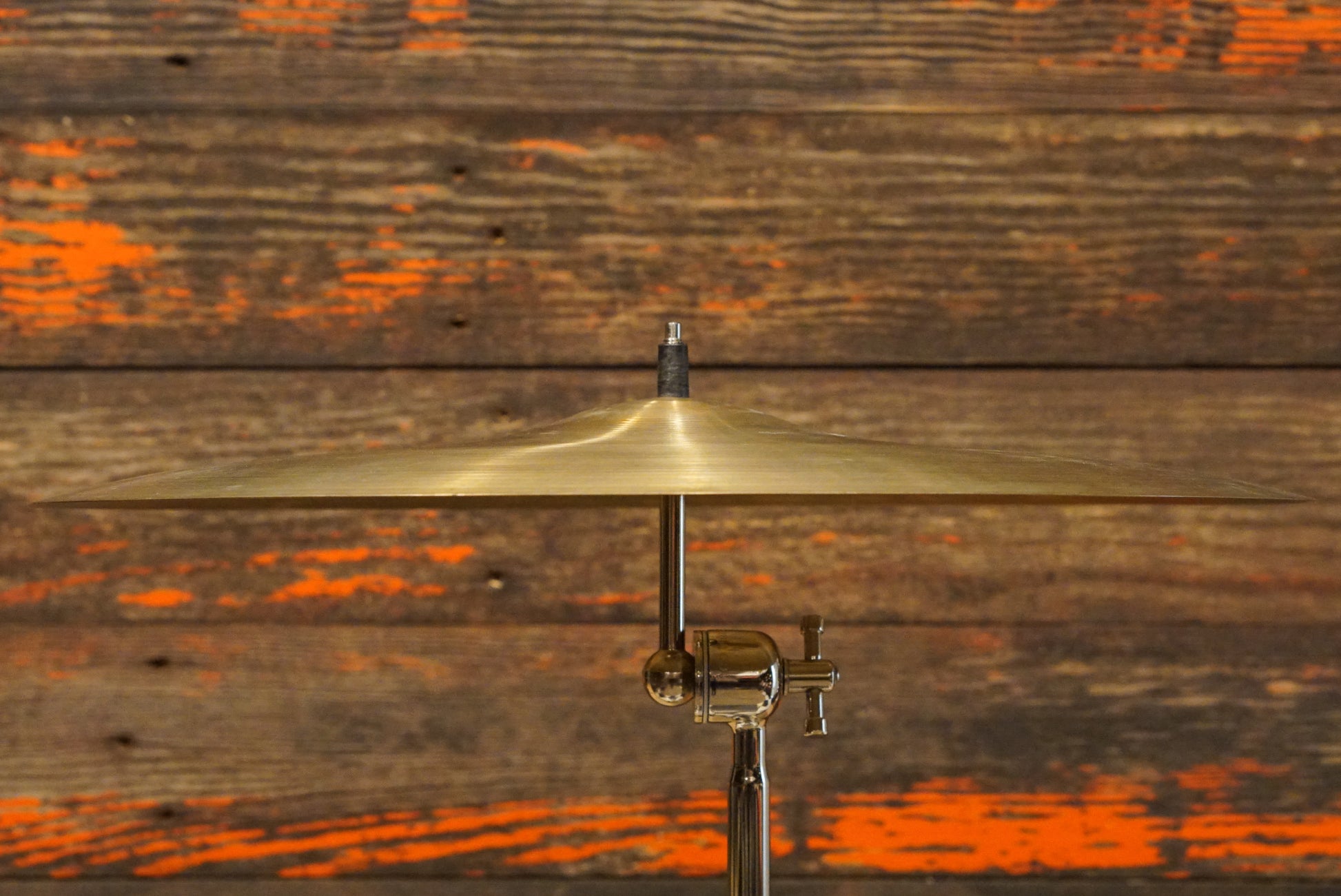 An 18" Zilco Crash dating to the 1968-'72 Azco era. Dry and throaty, with a funky and full wash and more integrated stick attack. In good condition with heavy patina and some perimeter roughness.