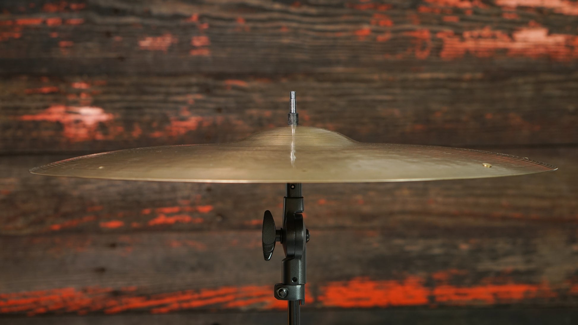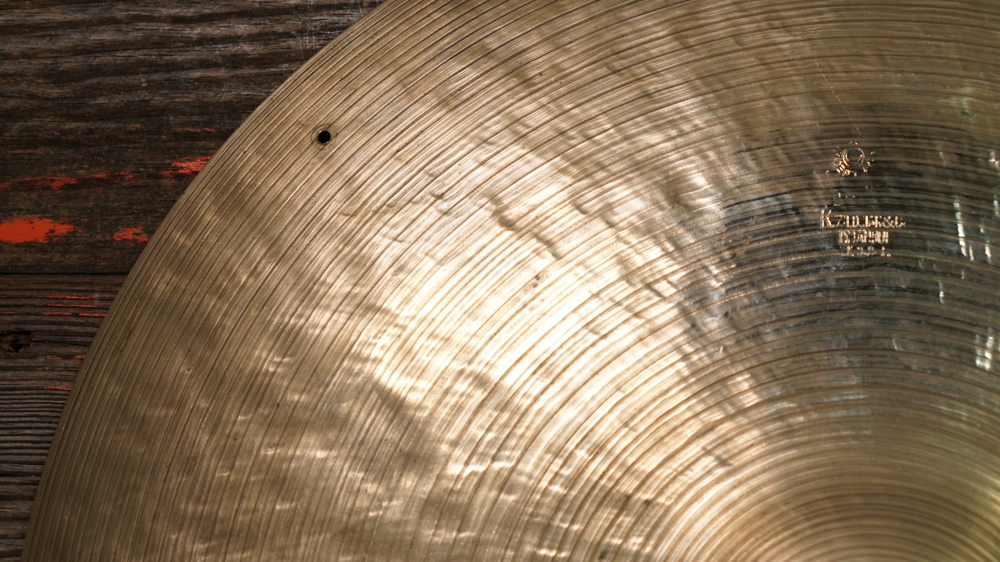 A 20" K. Zildjian ride dating to the 1959-1967 "Intermediate Stamp" Era. In great overall condition with light patina and slight perimeter roughness, as well as some keyhole. Friendly with a very well balanced stick and a crash that speaks calmly and smoothly. Drilled for eight rivets, of which only one is currently installed, adding some nice wash.